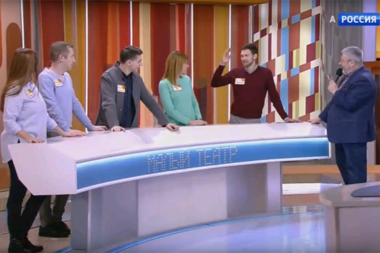 Last Saturday, the team of the Maly Theatre took part in a popular TV show "A Hundred to One." The Maly Theatre was represented by Mikhail Martyanov, Asya Dubrovskaya, Alexander Driven, Dmitriy Marin and Polina Dolinskaya.