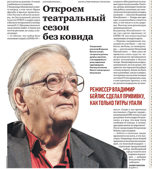 Об опасности коронавируса и эффективности вакцин известно давно, но некоторых людей вводят в замешательство мифы и страшилки про прививки, придуманные далекими от медицины людьми. Те же, кто столкнулся с ковидом, понимают — вакцинация — единственное решение проблемы. Владимиру Бейлису, жителю Тверского района, 84 года, но при встрече с этим уникальным человеком — известным советским и российским театральным режиссером, педагогом, народным артистом России, — о цифрах и датах не думаешь. А только улыбаешься и слушаешь.