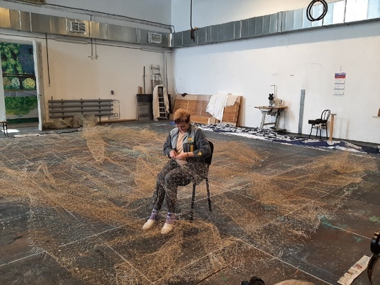 Часть живописного пола огорожена вбитыми гвоздями, выполняющими функцию разметки. Так мастерам проще работать с огромными полотнами ткани. В этот раз на нем раскинуты несколько кусков жесткой сетки, которую несколько работниц должны скрепить. Узелок за узелком они сплетаю грубые нитки, от которых, признаются женщины, уже побаливают пальцы. Затем они сядут на пол, возьмут раскаленные ножи и начнут вырезать напечатанные кружева. Белоснежный узор они прикрепят к сетке, которая позже украсит задник постановки другого спектакля - «Двенадцать месяцев». У входа в цех висит огромный ковер с портретом Александра II — это, как объясняет Людмила, еще один атрибут, не увидевший сцены.
