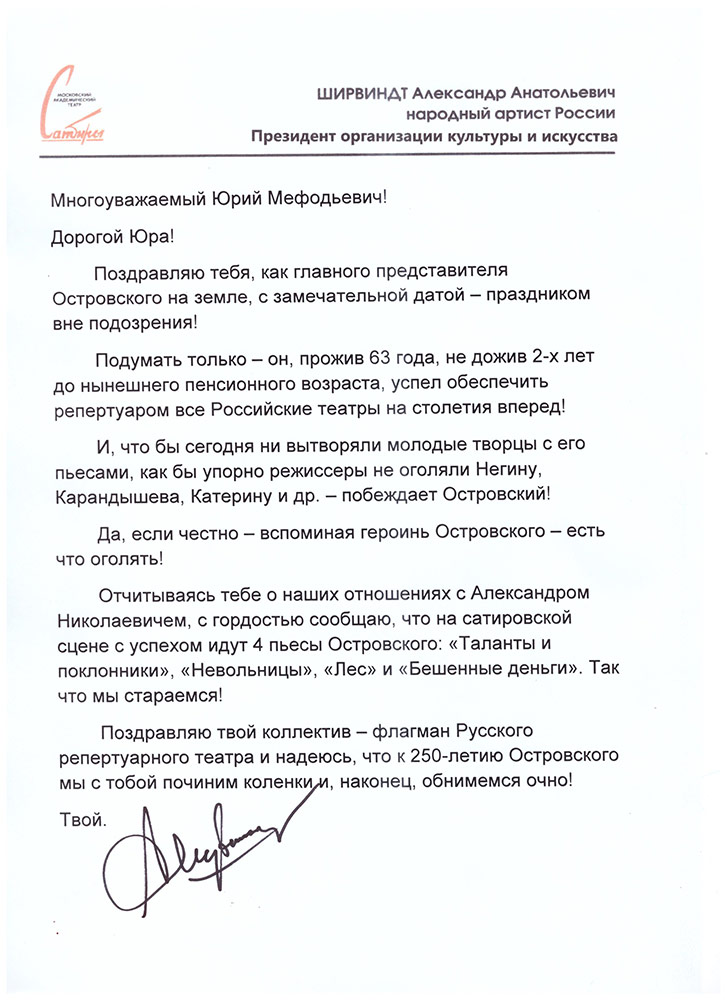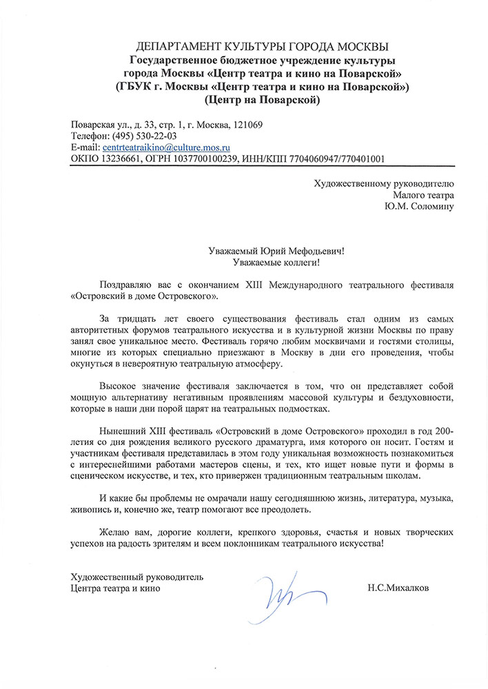 В воскресенье завершился XIII Международный театральный фестиваль "Островский в Доме Островского". В эти дни в театр приходило много телеграмм и адресов, связанных с проведением фестиваля и юбилеем Александра Николаевича Островского. Двумя адресами, которые мы получили от Александра Анатольевича Ширвиндта и Никиты Сергеевича Михалкова, мы хотим поделиться с вами.