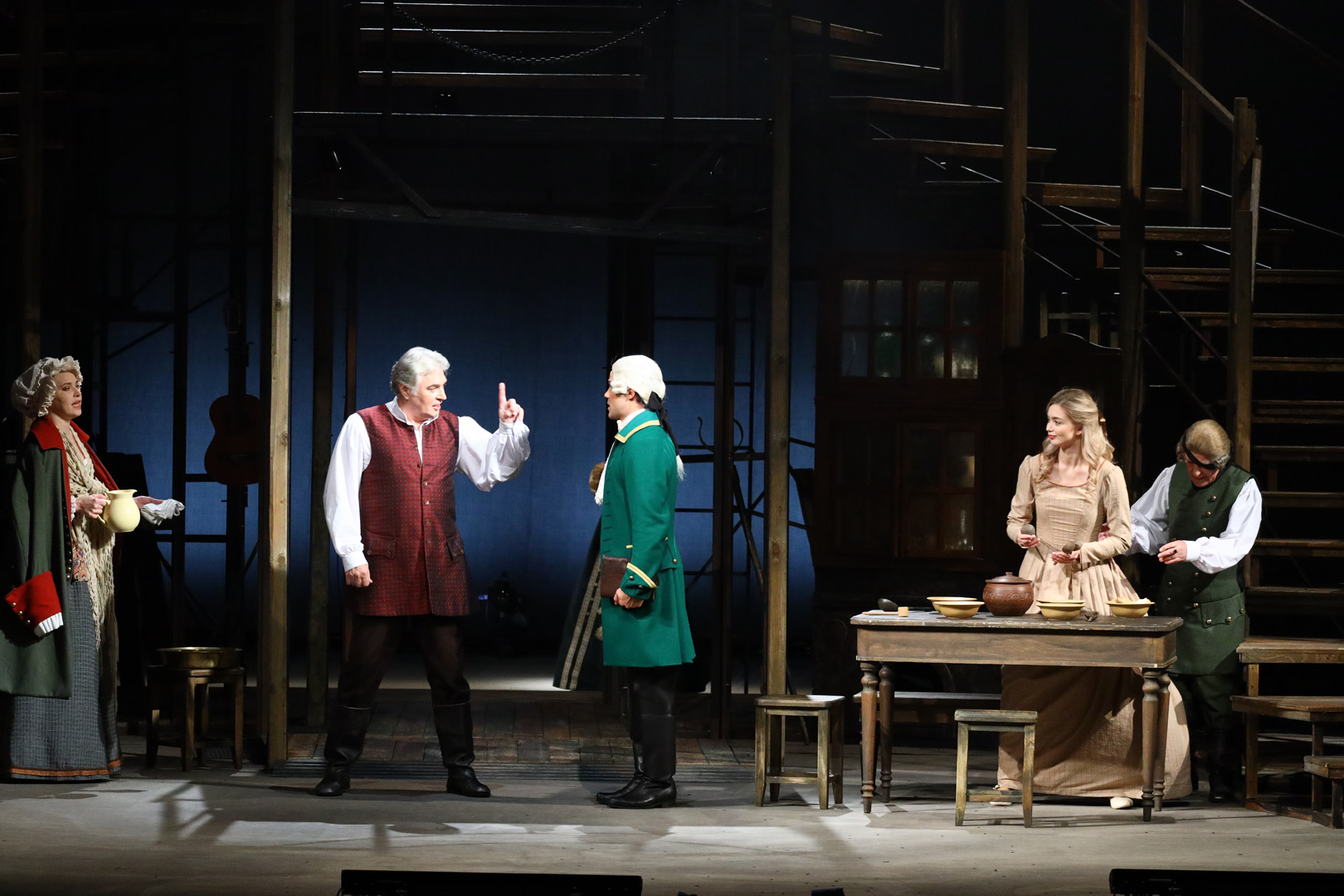 Именно так и поставлен спектакль — просто, лаконично, без пафоса и напыщенности, аккуратно и бережно транслируя в зал пушкинское слово и мысль. Роль снежной вьюги тут играет колышащийся белый занавес. Белогорская крепость предстает уютным деревянным домиком с антресолями (художник-постановщик Мария Утробина). А герои повести здесь вполне узнаваемы и в своем комизме, и в своем героизме.