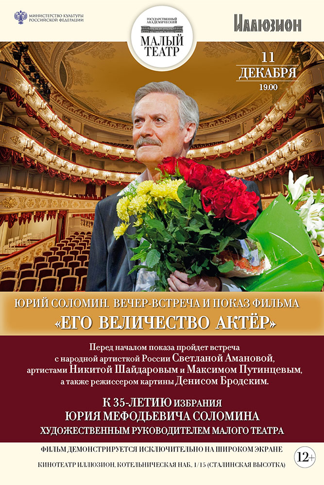 11 декабря в 19:00 в кинотеатре «Иллюзион» пройдет показ фильма «Его Величество Актёр», приуроченный к 35-летию избрания Юрия Мефодьевича Соломина художественным руководителем Малого театра.