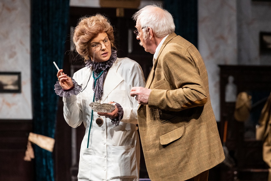 Швейцарский драматург Фридрих Дюрренматт предельно детально описал место действия пьесы, практически оставив инструкцию для сценографа. В Малом театре с уважением отнеслись к его пожеланиям, художник-постановщик Мария Утробина создала уютный, немного старомодный мир, в духе детективов Агаты Кристи. Теплый свет, ковры и дерево, кожаные кресла и охотничьи трофеи на стенах – здесь точно должно что-то произойти. Комедийная (по утверждению автора) история, собственно, и начинается с убийства…