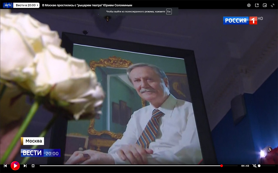 У Юрия Соломина было очень много ролей: артист театра и кино, режиссер, педагог, руководитель. С раннего утра у здания Малого театра – почитатели таланта Юрия Соломина. С артистом пришли проститься его коллеги, ученики и, конечно, поклонники. Юрий Соломин руководил Малым театром более 35 лет. Коллеги называют его рыцарем театра, который всю жизнь отстаивал принципы, в которые верил.