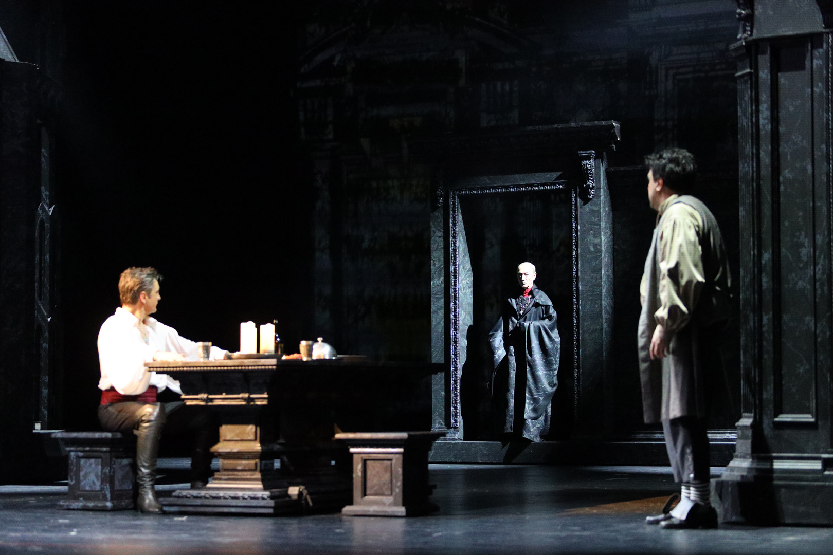 Ненасытный обольститель Дон Жуан в этом спектакле прежде всего уроженец Испании, страны, где бушуют страсти, которые не проявляются внешне, а как будто бы закованы в камень высоких готических соборов и дворцов. Именно таковы декорации Марии Рыбасовой. Черный камень в архитектуре и мебели, как и черный кружевной шарф-вуаль Эльвиры, будут сопровождать закоренелого ловеласа до конца его дней.