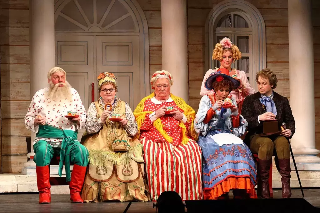Вообще, ощущение доброго старого провинциального театра века, скажем, девятнадцатого не покидало на протяжении всего спектакля. Спускающиеся на штанкетах тряпичные декорации, расписанные в нарочито примитивном стиле. Открывающиеся створки декораций являли картонные фигуры живности – свинок, курочек, кошечек, гусей. Угощение на купеческих столах было бумажным, а неимоверной величины арбузы и тыквы в садах – фанерными. Вместе все напоминало детскую книжку-раскладушку с картонными человечками (художник-постановщик Мария Утробина). Однако актеры вопреки бумажным декорациям играли в прежней реалистической манере, словно их окружает добротная старинная мебель, играли, как говорится, по школе, не уронив репутацию Малого театра.