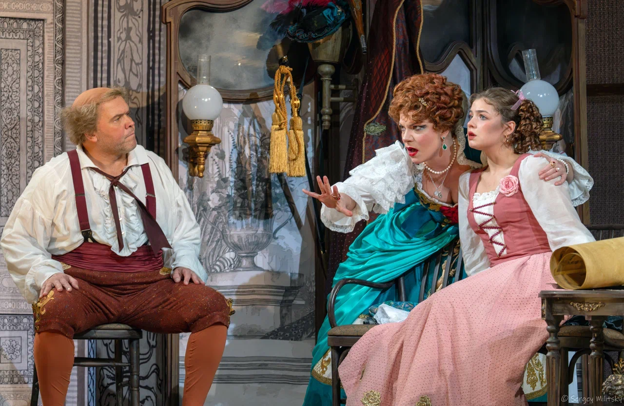 Да, спектакль смешной. И это никакая не высокая комедия, а самый настоящий водевиль: с шутками в тексте, со смешными персонажами (о них чуть позже), с уморительными режиссёрскими придумками. Но мы словно попадаем в театр XIX века. Главный герой бегает по сцене с приклеенной лысиной. Поверьте, в Малом театре есть специалисты, которые могли приклеить её так, чтобы самый придирчивый зритель не отличил от настоящей. Но в позапрошлом веке этого не умели…