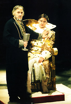 Со сложностью, правда, возникают сложности. Переходы с крика на звучный таинственный шепот свидетельствуют об определенном квалификационном уровне артистов, но мало говорят о персонажах, что неизменно равны себе. Датский принц Христиан (А. Вершинин) наивен и чист, Семен Годунов (Н. Верещенко) зловещ и исполнителен, послы и бояре сияют достаточным количеством цветов радуги, а у стрельцов наличествуют бердыши. XVII век — понятное дело. Такое же понятное, как муки Бориса, лукавое коварство Шуйского, страдания инокини Марфы — матери убитого царевича. XVII век, Древняя Русь, средние века (или как это называется?) — но в меру. Не заниматься же «археологией». А потому обрядим актеров в условно-древнерусские кафтаны, обозначим боярские бороды эспаньолками и шкиперками, возведем грандиозную декорацию (благо потолок в театре высокий) с куполами, иконными окладами (дыры вместо ликов, вероятно, что-то символизируют) и крестами, врубим по радио юрловскую капеллу и напишем в программе: композитор Г. В. Свиридов. А что? Разве не Свиридов? Все правда, и все правильно. И главное — понятно, словно и не стихами писана треклятая пьеса.