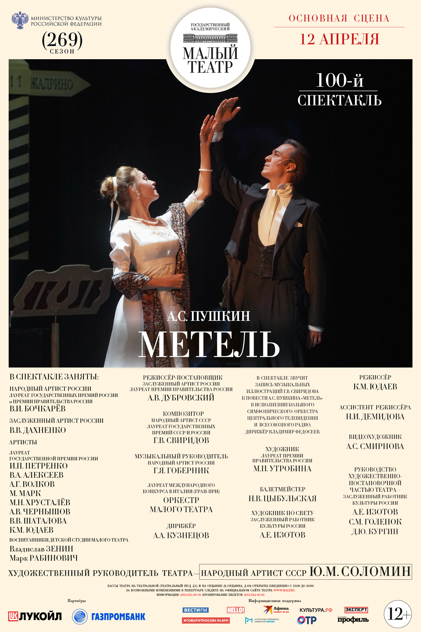 Александр Сергеевич Пушкин – один из наших любимых авторов. В разные годы театр обращался ко многим произведениям великого русского классика – «Борис Годунов», «Станционный смотритель», «Русалка», «Маленькие трагедии», «Пиковая дама», «Сказка о царе Салтане»… В 2018 году актёр и режиссёр Алексей Дубровский выбрал для постановки романтическую повесть «Метель», рассказывающую о любви, благородстве и воле Случая. Дубровский переводит литературную основу в не совсем привычное театральное действо. Всё своё внимание режиссёр и исполнители сосредотачивают на гениальном тексте, сопровождаемом великолепной музыкой Георгия Свиридова. «Герои вальсируют, кружатся, комментарии Издателя и видеоинсталляция над сценой, в которой постоянно бегут пушкинские строки и оживают его рисунки, напоминают о том, что мы просто листаем повесть, прислушиваясь к мыслям соотечественников, живших за два века до нас, и делаем остановки» (Нина Катаева, «Столетие»).