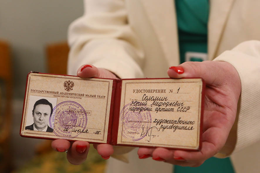 Документы, рассказывают о ролях Соломина-актёра в «Живом трупе» Толстого и «Лешем» Чехова, интересно разглядывать пометки, которые делал артист, готовясь выйти к зрителям. Видим и первую его роль в спектакле «Когда горит сердце» – «без ниточки», как говорили в императорском театре, то есть, настолько маленькую, что умещалась на одном листочке, не надо было сшивать с другими. Среди документов студенческий билет Юрия Мефодьевича и пропуск в Малый театр. Здесь же тетрадь для записей – «Киргизская студия», в которой описана работа с его первым курсом в училище. А спектакль Соломина «Ревизор», визитная карточка Малого театра на данный момент, идёт с постоянными аншлагами, в последние годы каждый сезон открывают именно им.