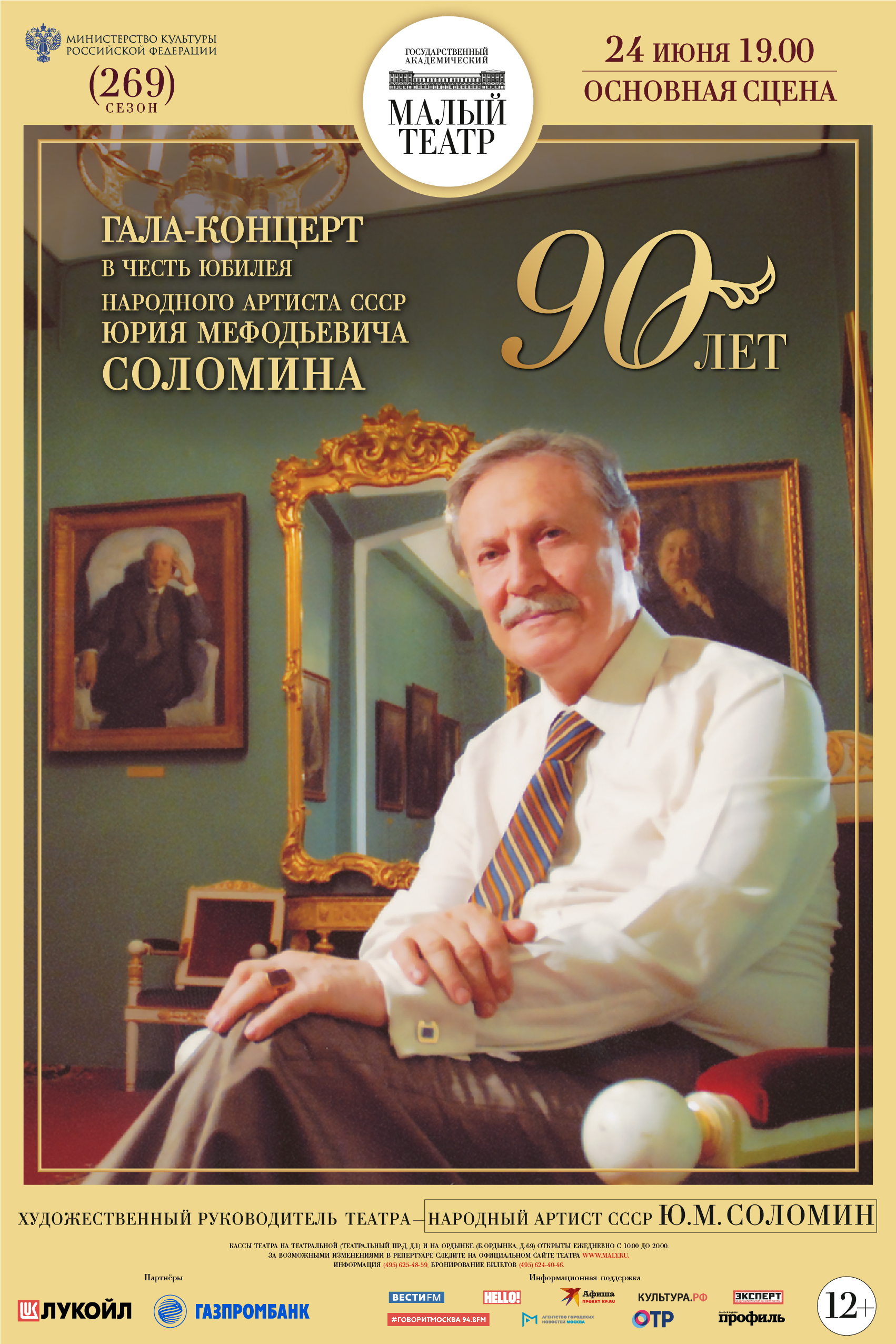 24 июня на Исторической сцене Малого театра прошёл гала-концерт, посвящённый 90-летию со дня рождения Юрия Соломина. Режиссё концерта - главный режиссёр Малого театра Алексей Дубровский.