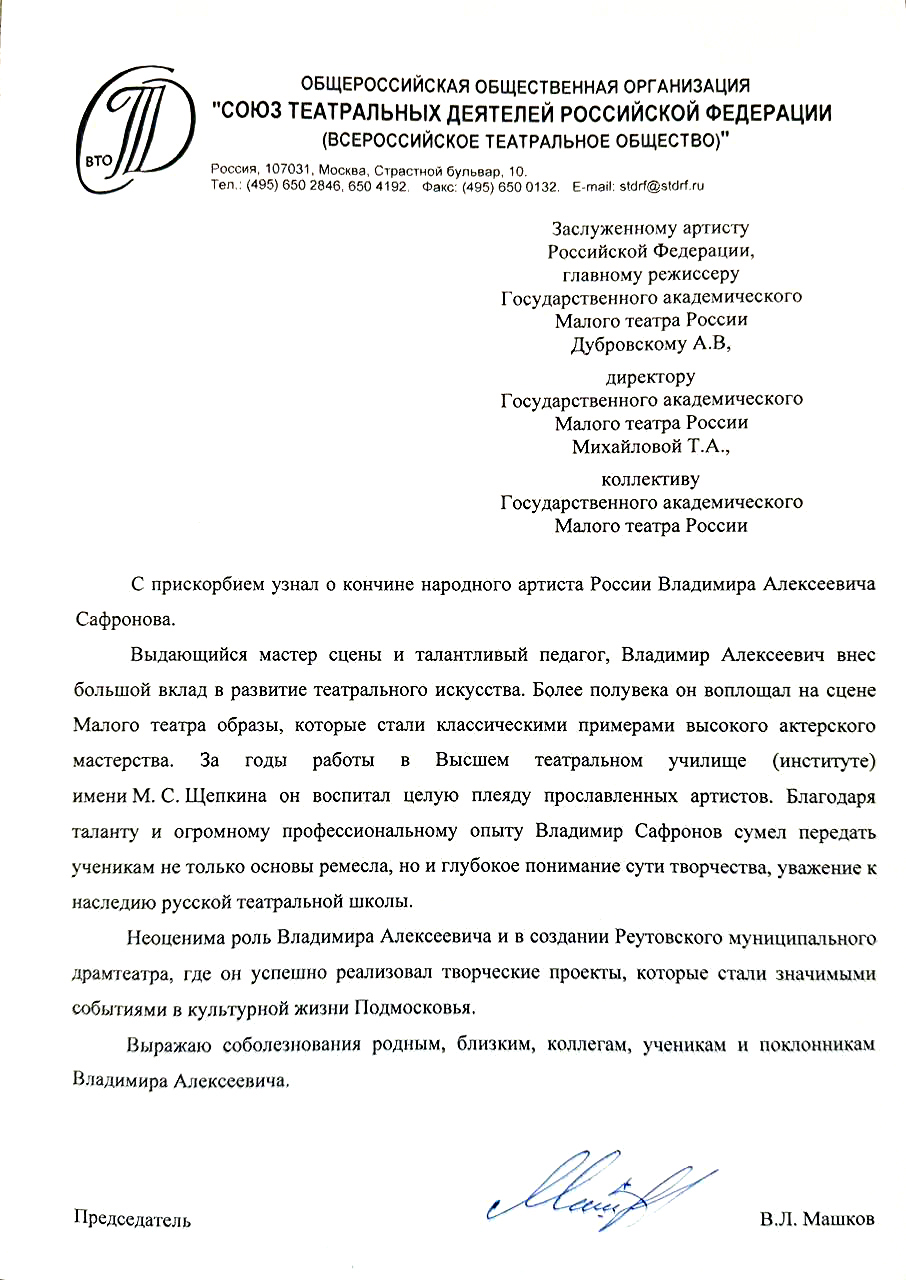 «ПРИСКОРБНОЙ НОВОСТЬЮ СТАЛ УХОД ИЗ ЖИЗНИ НАРОДНОГО АРТИСТА РОССИЙСКОЙ ФЕДЕРАЦИИ ВЛАДИМИРА АЛЕКСЕЕВИЧА САФРОНОВА. ОН ПОСВЯТИЛ СВОЮ ЖИЗНЬ ОТЕЧЕСТВЕННОЙ КУЛЬТУРЕ. ЕГО МНОГОГРАННЫЙ ТАЛАНТ И ХАРИЗМА НАШЛИ ОТРАЖЕНИЕ ВО ВСЕХ СФЕРАХ ДЕЯТЕЛЬНОСТИ, БУДЬ ТО ВЫСТУПЛЕНИЯ В ТЕАТРЕ, ИЛИ РАБОТА В КИНО. ОТДЕЛЬНО СТОИТ ОТМЕТИТЬ ВКЛАД ВЛАДИМИРА АЛЕКСЕЕВИЧА В ВОСПИТАНИЕ НОВЫХ ПОКОЛЕНИЙ АРТИСТОВ. НА ПРОТЯЖЕНИИ ДЕСЯТИЛЕТИЙ ВЕРНОГО СЛУЖЕНИЯ СЦЕНЕ ГОСУДАРСТВЕННОГО АКАДЕМИЧЕСКОГО МАЛОГО ТЕАТРА РОССИИ ВЛАДИМИР САФРОНОВ ПОКОРЯЛ ЗРИТЕЛЕЙ НЕПОВТОРИМЫМИ ОБРАЗАМИ. ОН ОСТАВИЛ УНИКАЛЬНОЕ ТВОРЧЕСКОЕ НАСЛЕДИЕ, КОТОРОЕ МЫ БУДЕМ БЕРЕЖНО ХРАНИТЬ. ПРОШУ ПЕРЕДАТЬ СЕМЬЕ, ДРУЗЬЯМ И КОЛЛЕГАМ ВЛАДИМИРА АЛЕКСЕЕВИЧА МОИ ИСКРЕННИЕ СОБОЛЕЗНОВАНИЯ. СВЕТЛАЯ ПАМЯТЬ».