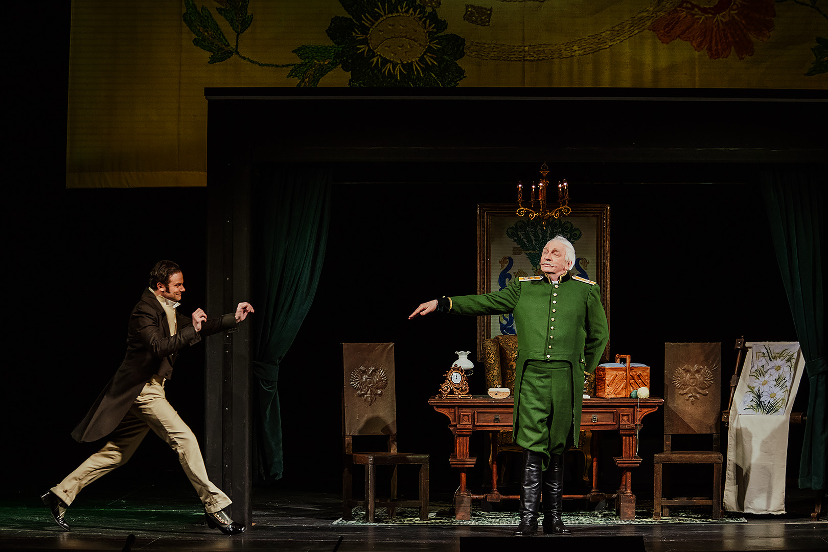 «Для меня, - рассказывает режиссёр-постановщик спектакля Алексей Дубровский, - не исключая гениального юмора Николая Васильевича, одной из основных тем спектакля, как ни странно, является одиночество. Внимательно перечитав поэму, я обнаружил, что практически у всех основных персонажей есть слова и целые монологи по этому поводу. Да и сам Чичиков в финале говорит, что он затеял всю эту мошенническую комбинацию лишь для того, чтобы «иметь жену и детей, исполнить долг человека». Прибавьте к этому «бродячие» по России души умерших крестьян и одинокую птицу-тройку, от которой «косясь, постораниваются и уступают ей дорогу другие народы и государства», и словосочетание «мёртвые души» начинает приобретать новый смысл».