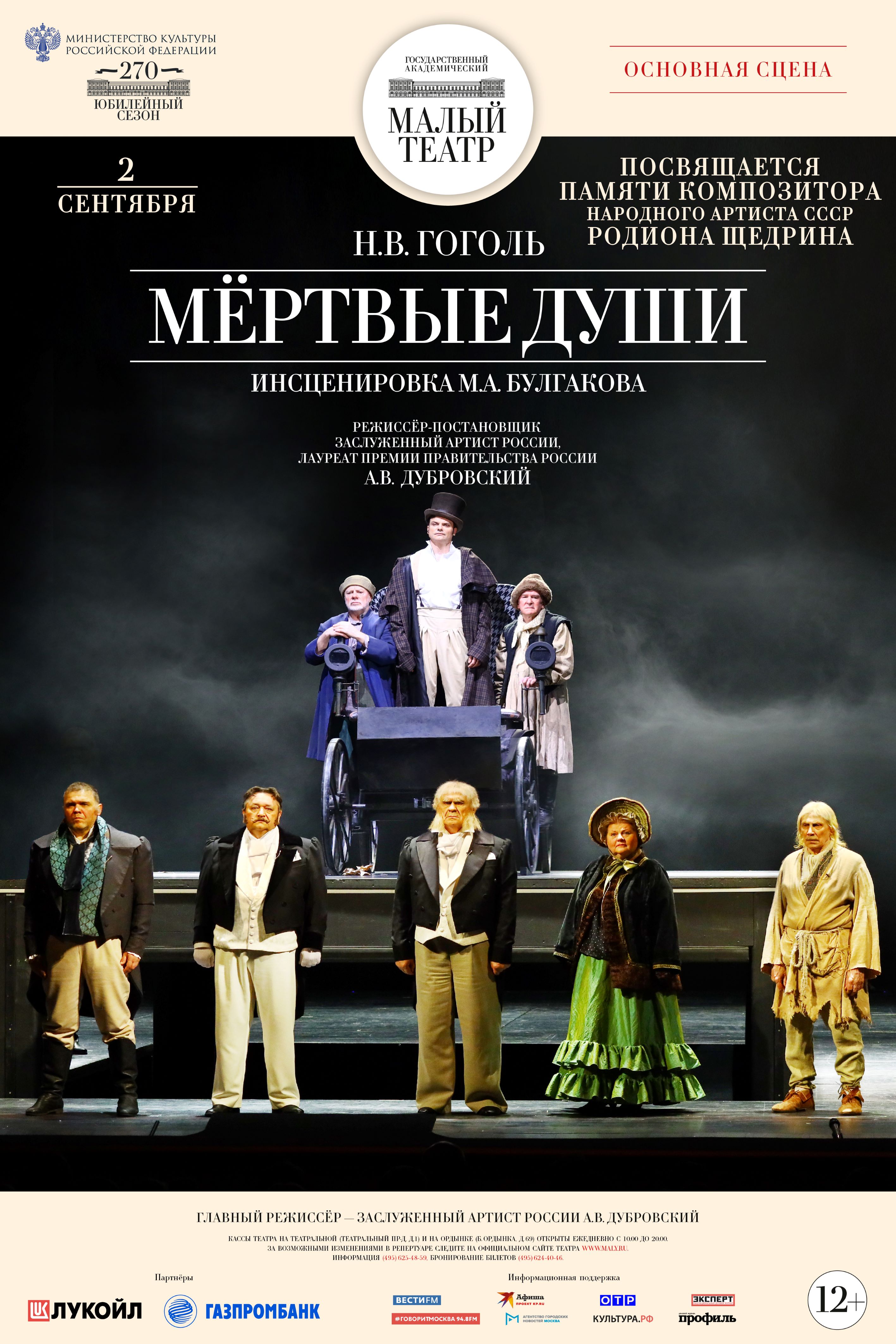 2 сентября показ спектакля «Мёртвые души» Н.В. Гоголя посвящается памяти народного артиста СССР Родиона Щедрина. В нашем спектакле звучит музыка этого великого композитора, создавая особую атмосферу. Для него Николай Гоголь оказался особенным автором, как и для Малого: над оперой «Мёртвые души» Родион Щедрин работал 10 лет, создав уникальное музыкальное произведение. Малый театр также дождался своего времени: название не появлялось в нашем репертуаре после революции.