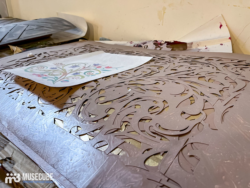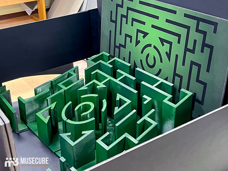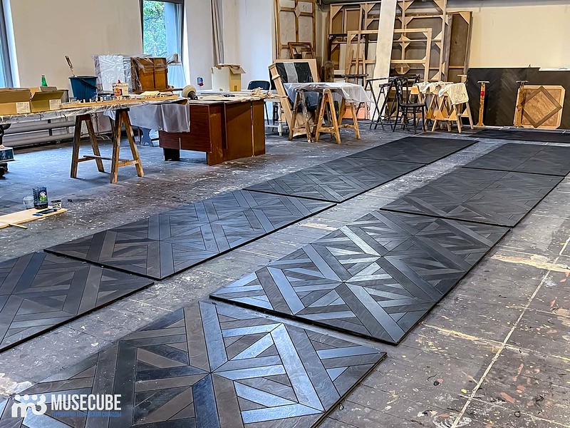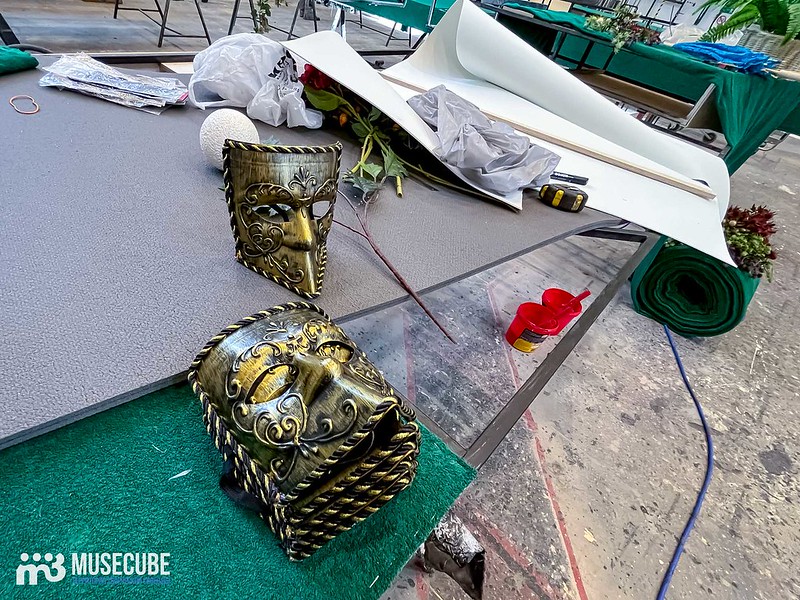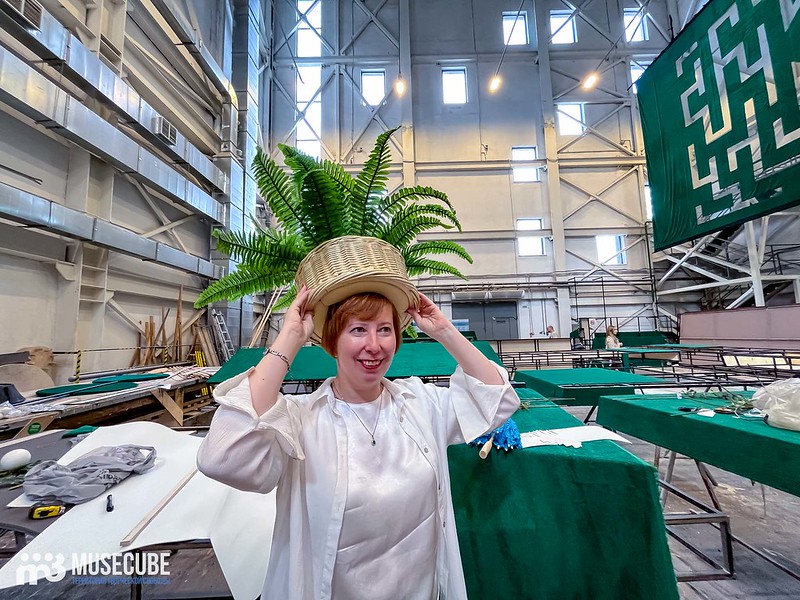 В процессе перемещения по цехам Людмила Марьянова рассказывала также о некоторых тонкостях постановочного процесса: художник-постановщик всегда включается в процесс подготовки спектакля с самого начала, когда режиссёр еще только формулирует задачи, художник уже думает, как это возможно воплотить на сцене. В первом же помещении — переговорной — был макет основной декорации будущей премьеры: растительный английский лабиринт, а также визуалы нескольких задников сцены и даже образцы тканей для лабиринта и деревьев; затем можно было увидеть воочию, как создается собственно задник: его тканевые зеленые составляющие прибиты гвоздиками к полу — и вручную пришиваются к черной сетке (иногда это занимает месяцы работы!). В следующих мастерских художник докрашивал в зеленый цвет миллиметры не зашитых зеленью металлических остовов лабиринта; а также кропотливо вырезались по уникальным шаблонам деревья. Один из готовых задников был растянут на высоте на штанкете, чтобы он успел отвисеться (но не успел покрыться деревянной стружкой, например — ведь параллельно уже почти год делаются декорации для «Анны Карениной»; и для нее же в 12 оттенков черного (вручную и тушью!) красится паркет для планшета сцены).