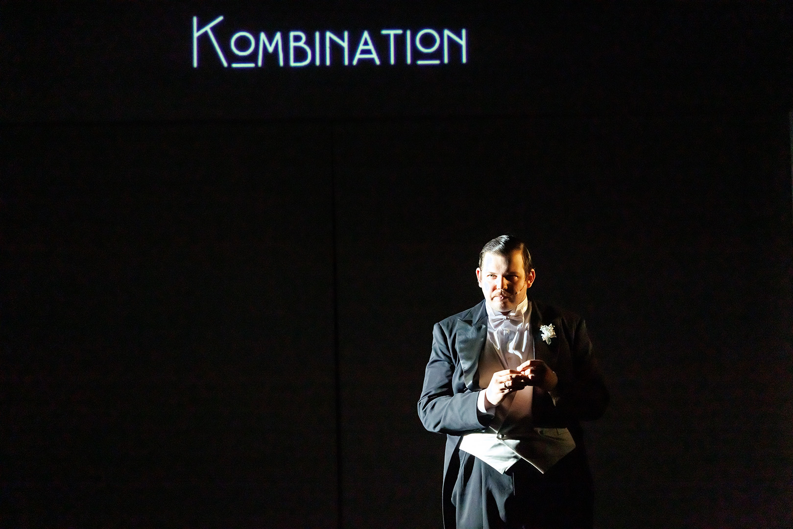 Именно со сцены знакомства шахматиста с будущей супругой и начинается спектакль Даная. Комментируя работу с текстом Набокова, режиссер, также выступающий автором сценической версии, заметил, что язык автора в "Защите Лужина" предельно сложен. Вместе с тем Данай не стремился привнести в уже написанное в романе что-то кардинально новое. "Я хотел максимально сохранить в спектакле то, что уже было заложено самим Набоковым", - пояснил он после предпоказа постановки, добавив, что пошел по пути линейного повествования.