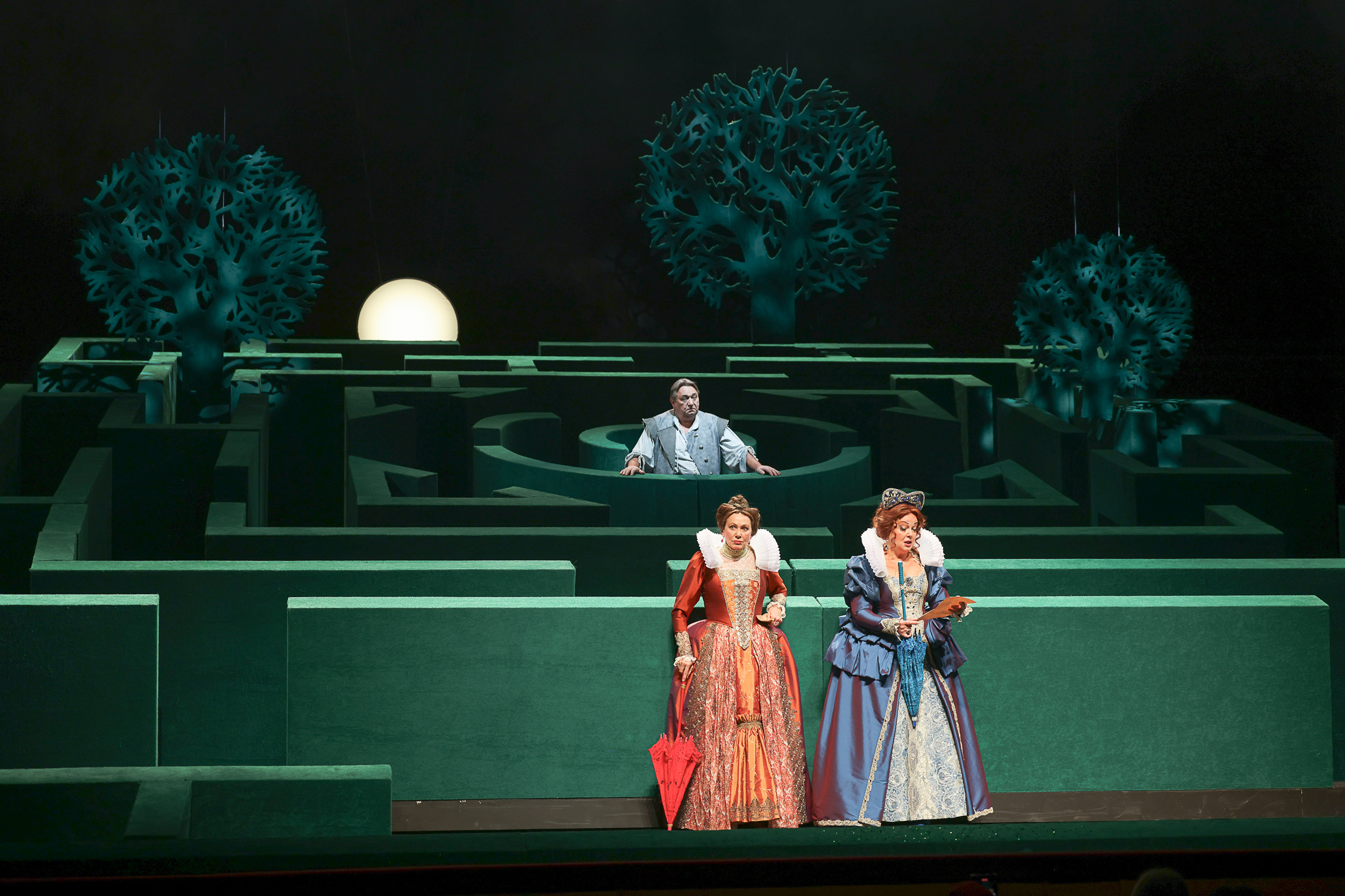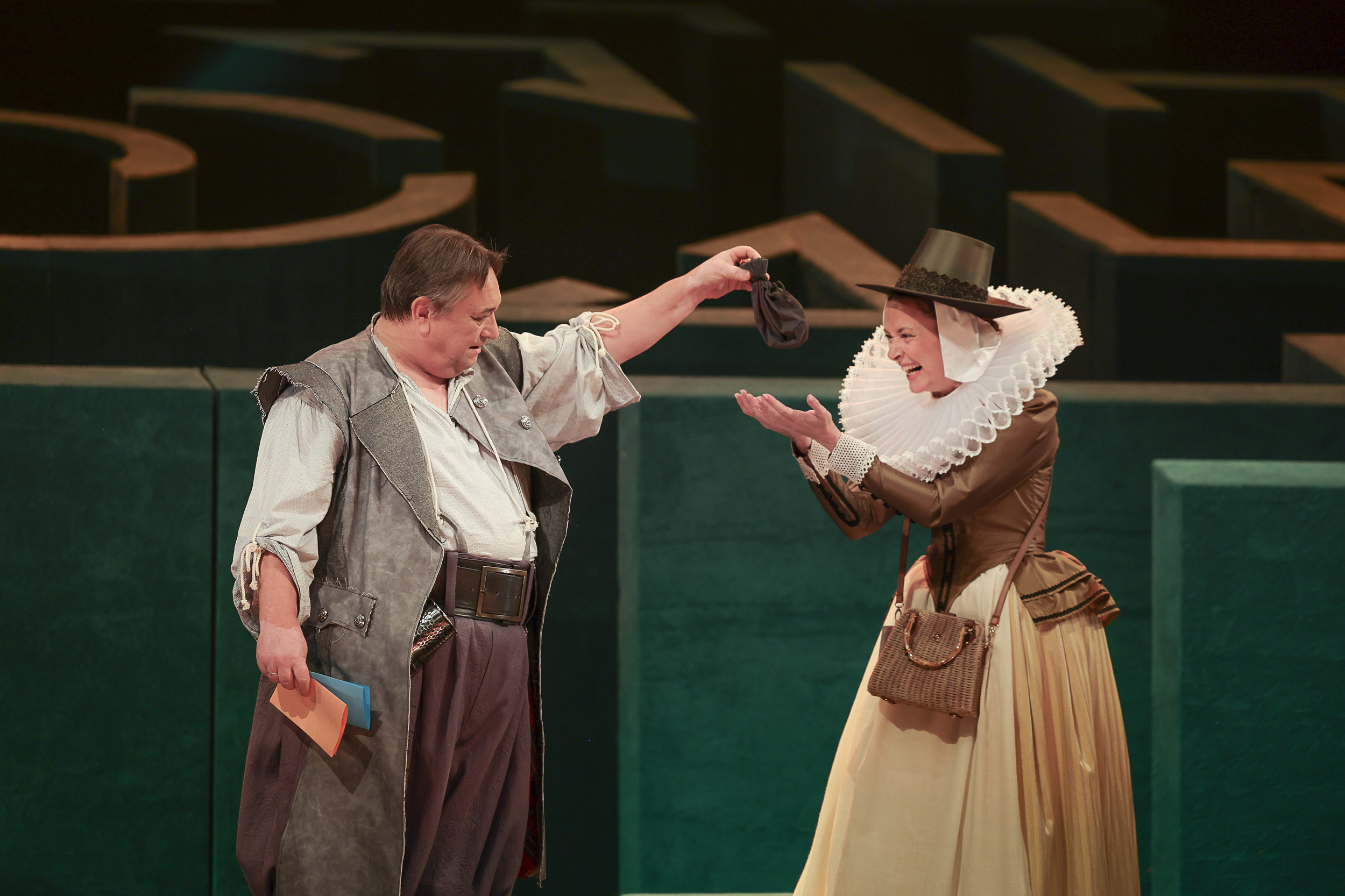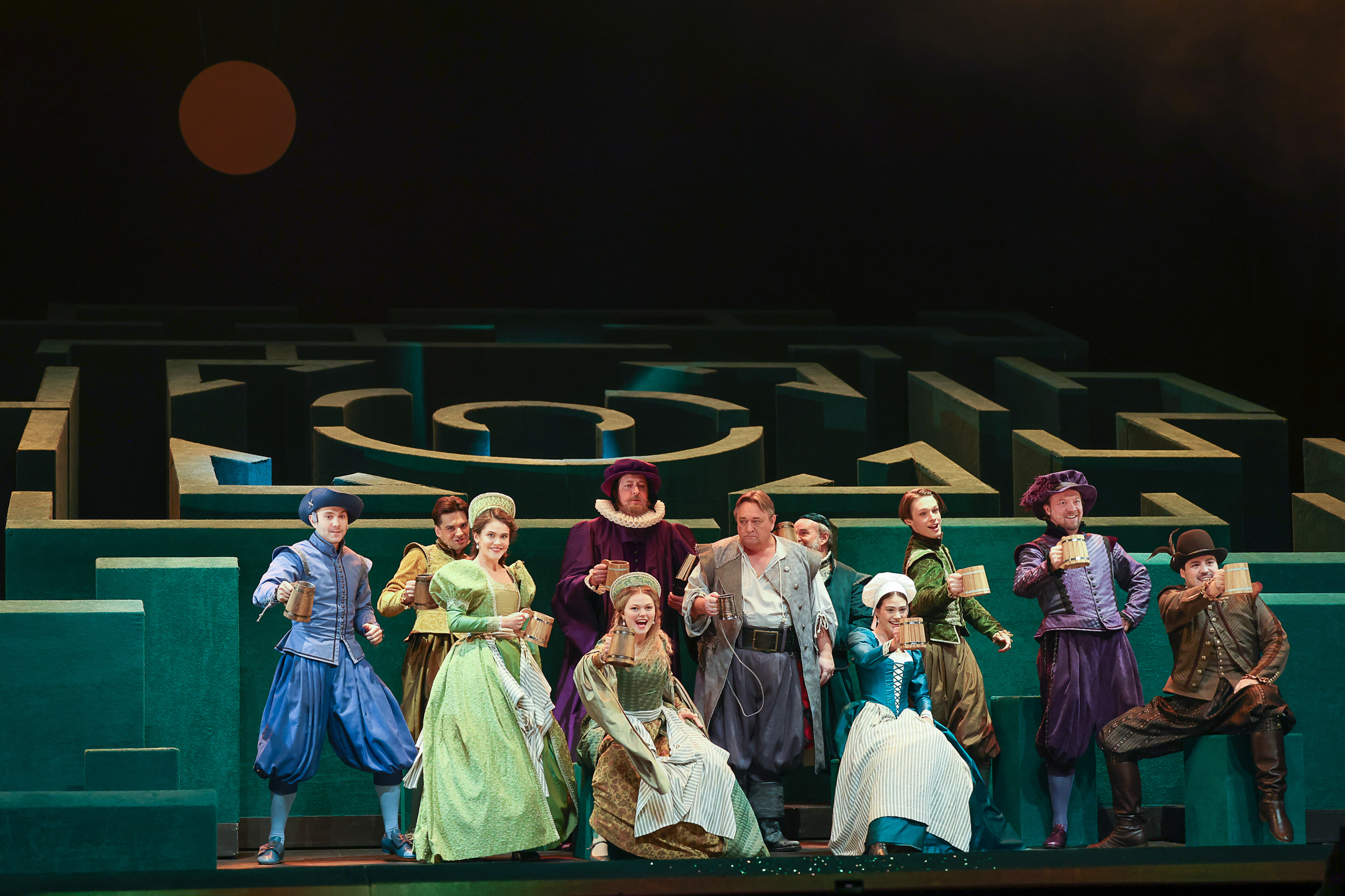 Стоит только ветреному сэру Джону Фальстафу приударить сразу за двумя замужними виндзорскими дамами, как тут же он становится персонажем комедии интриги, который бесконечно попадает в смешные положения. Почтенные жёнушки раскрывают коварный замысел «гнусного волокиты» и решают его проучить. Действие разворачивается в огромном лабиринте. Этот образ, подчеркивающий роль случайности и игры в развитии сюжета, придумал художник-постановщик Максим Обрезков. Героям, вовлечённым в безобидную шутку, предстоит найти выход из сети запутанных дорожек, наивных конфликтов.