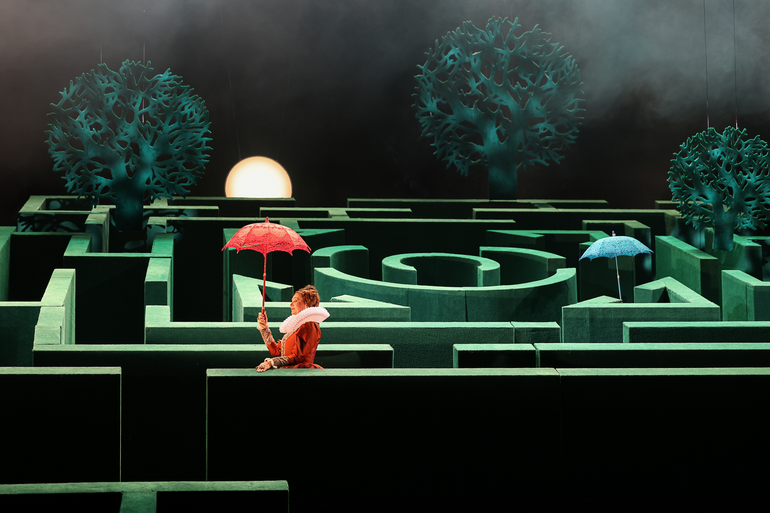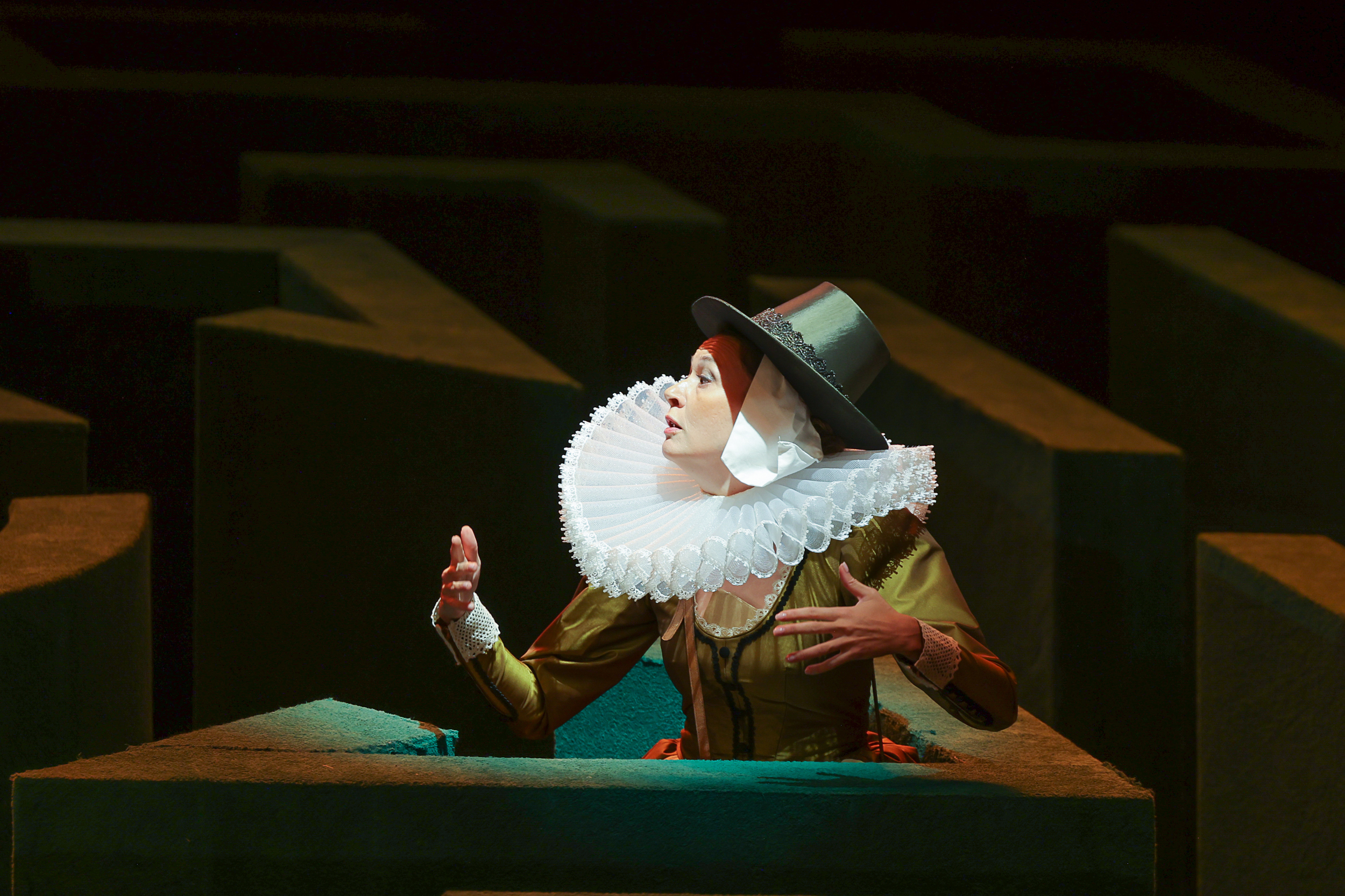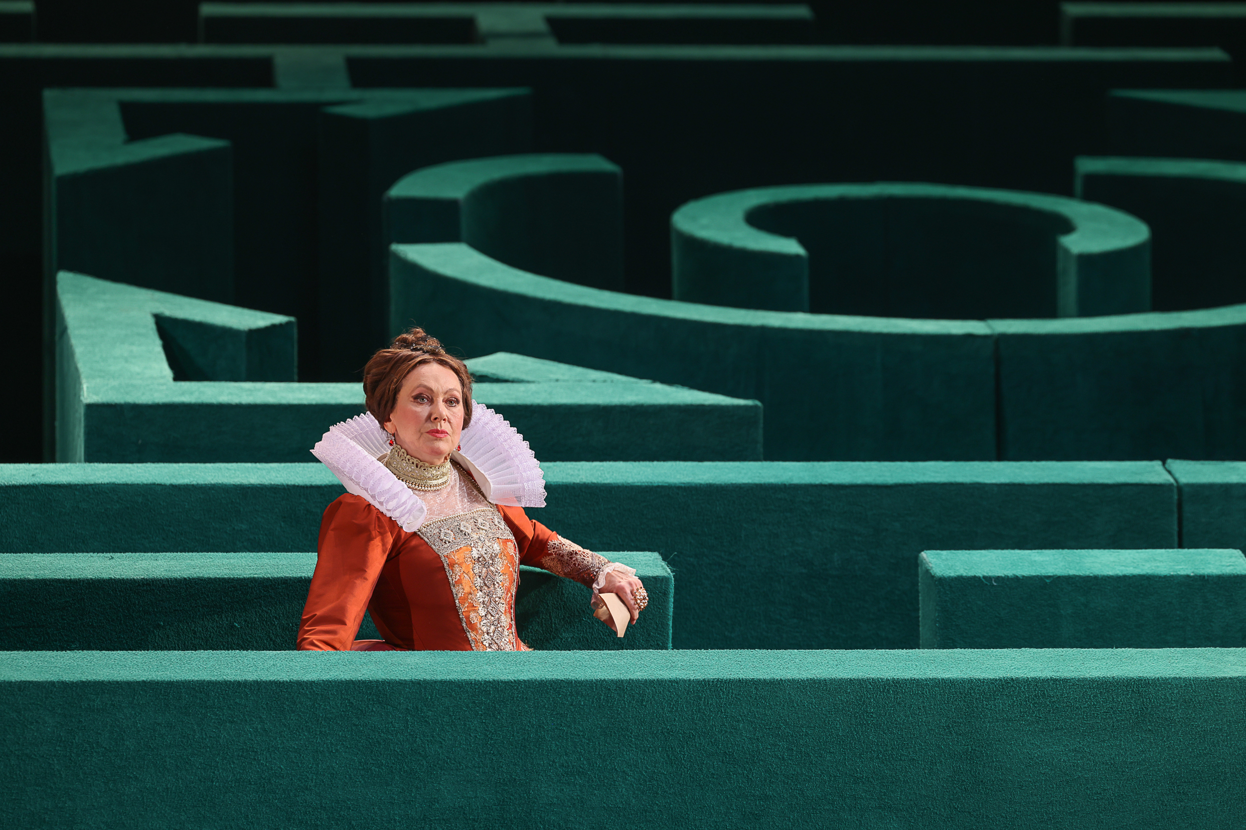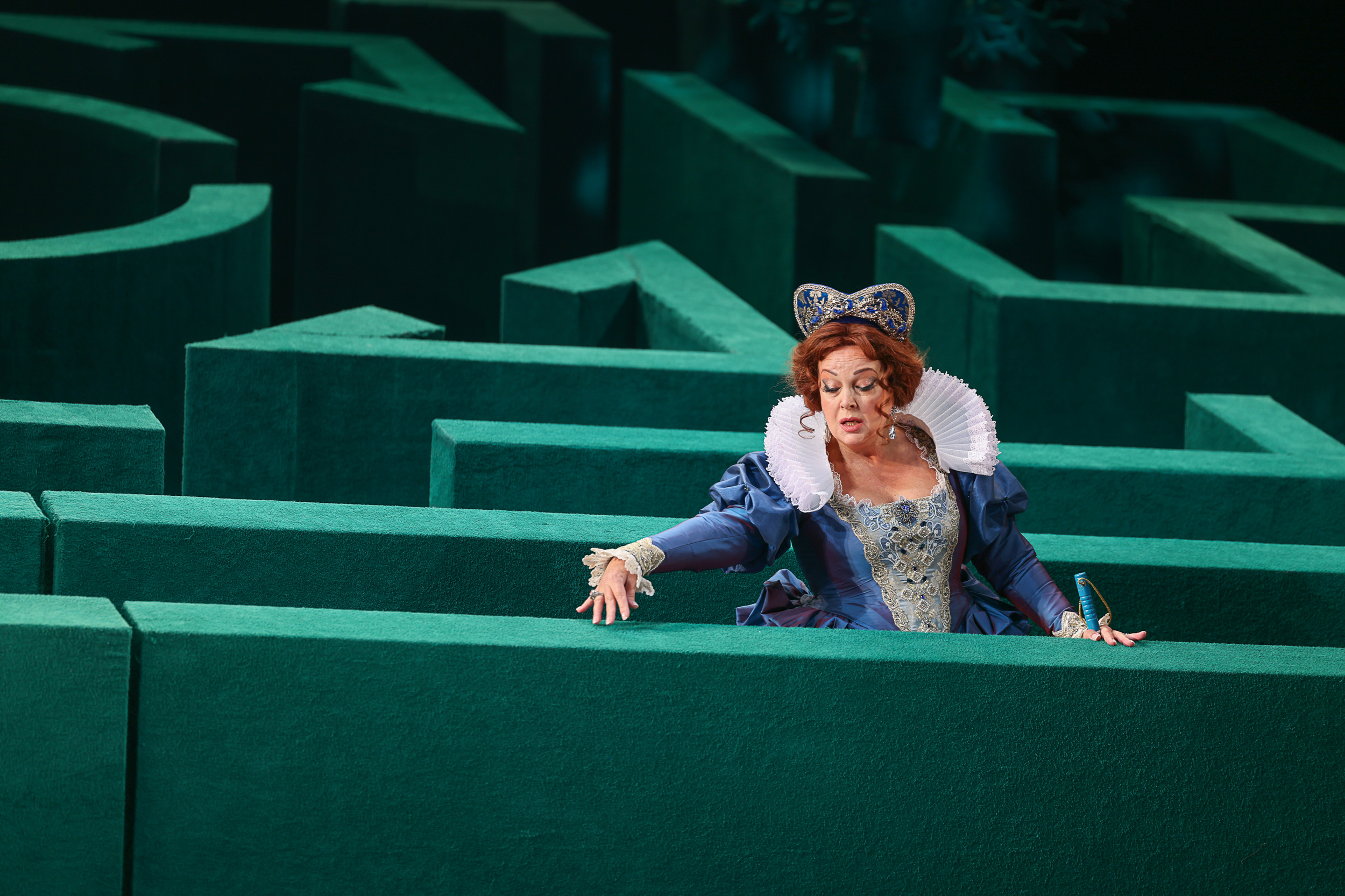 Стоит только ветреному сэру Джону Фальстафу приударить сразу за двумя замужними виндзорскими дамами, как тут же он становится персонажем комедии интриги, который бесконечно попадает в смешные положения. Почтенные жёнушки раскрывают коварный замысел «гнусного волокиты» и решают его проучить. Действие разворачивается в огромном лабиринте. Этот образ, подчеркивающий роль случайности и игры в развитии сюжета, придумал художник-постановщик Максим Обрезков. Героям, вовлечённым в безобидную шутку, предстоит найти выход из сети запутанных дорожек, наивных конфликтов.