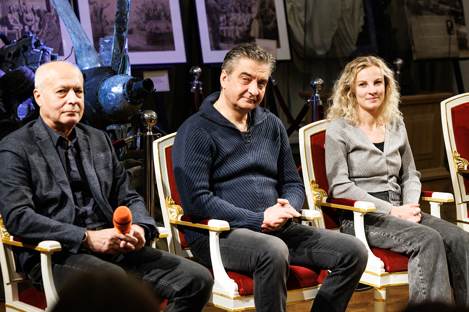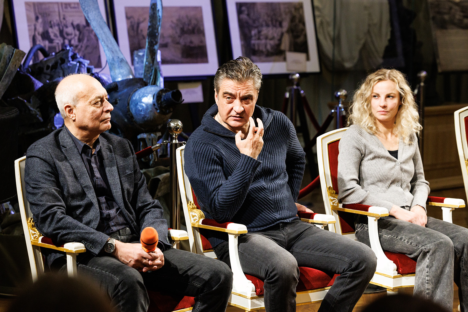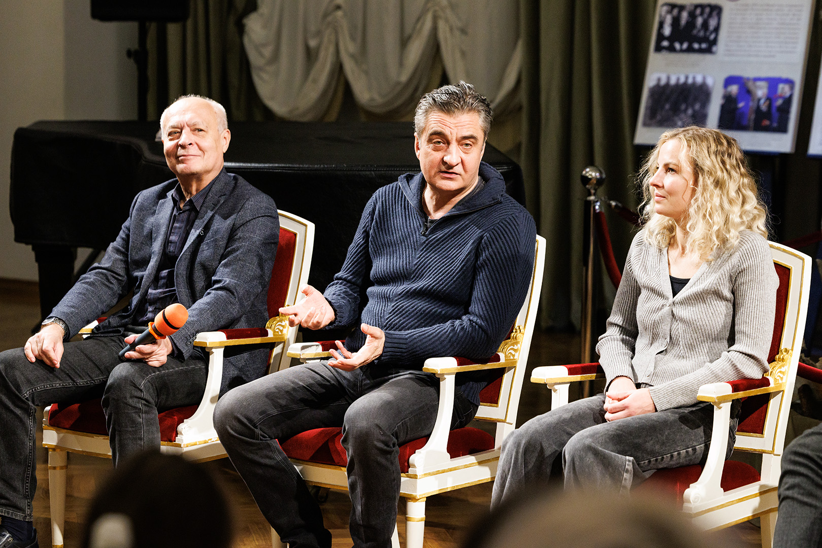 В вечер пятницы вместе со зрителями о личности Петра I, его реформах и о сложности взаимоотношений с сыном беседовали режиссер-постановщик Владимир Драгунов, исполнители главных ролей – заслуженный артист России Андрей Чубченко (Пётр I), артисты Станислав Сошников (Царевич Алексей) и Ольга Плешкова (Ефросинья).
