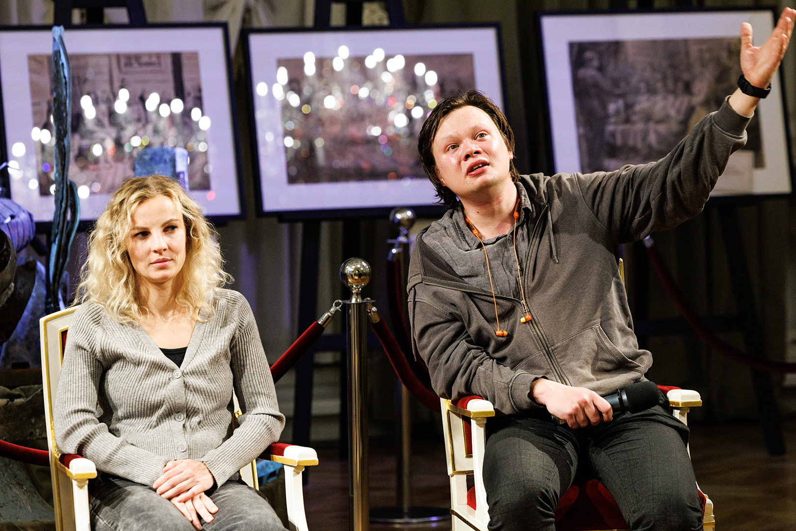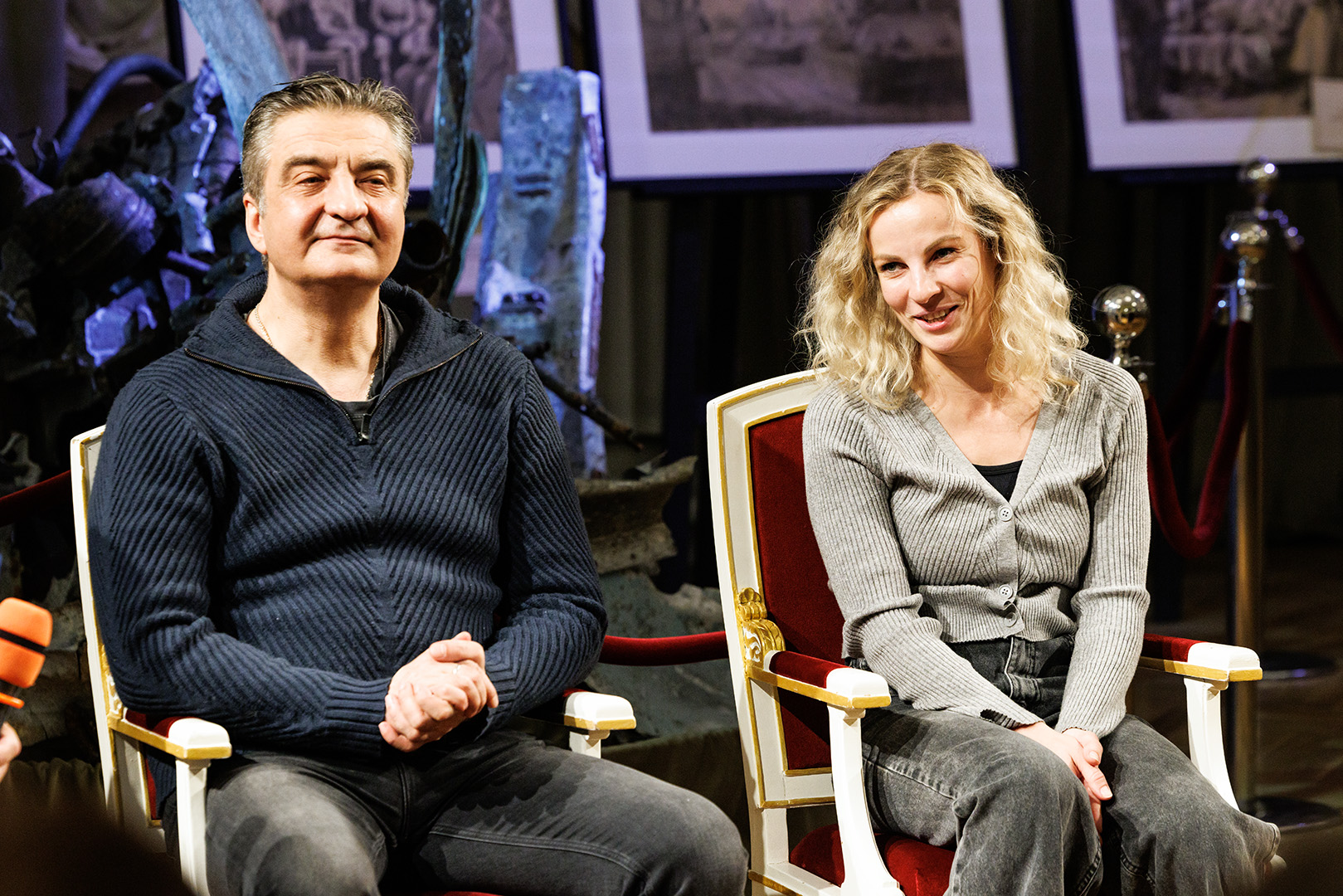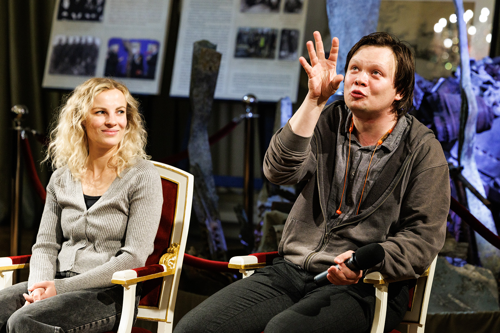 В вечер пятницы вместе со зрителями о личности Петра I, его реформах и о сложности взаимоотношений с сыном беседовали режиссер-постановщик Владимир Драгунов, исполнители главных ролей – заслуженный артист России Андрей Чубченко (Пётр I), артисты Станислав Сошников (Царевич Алексей) и Ольга Плешкова (Ефросинья).