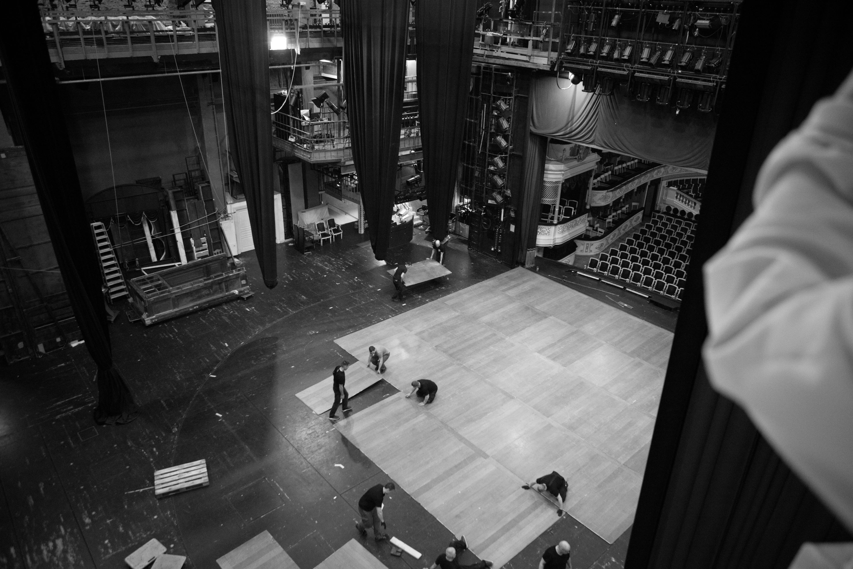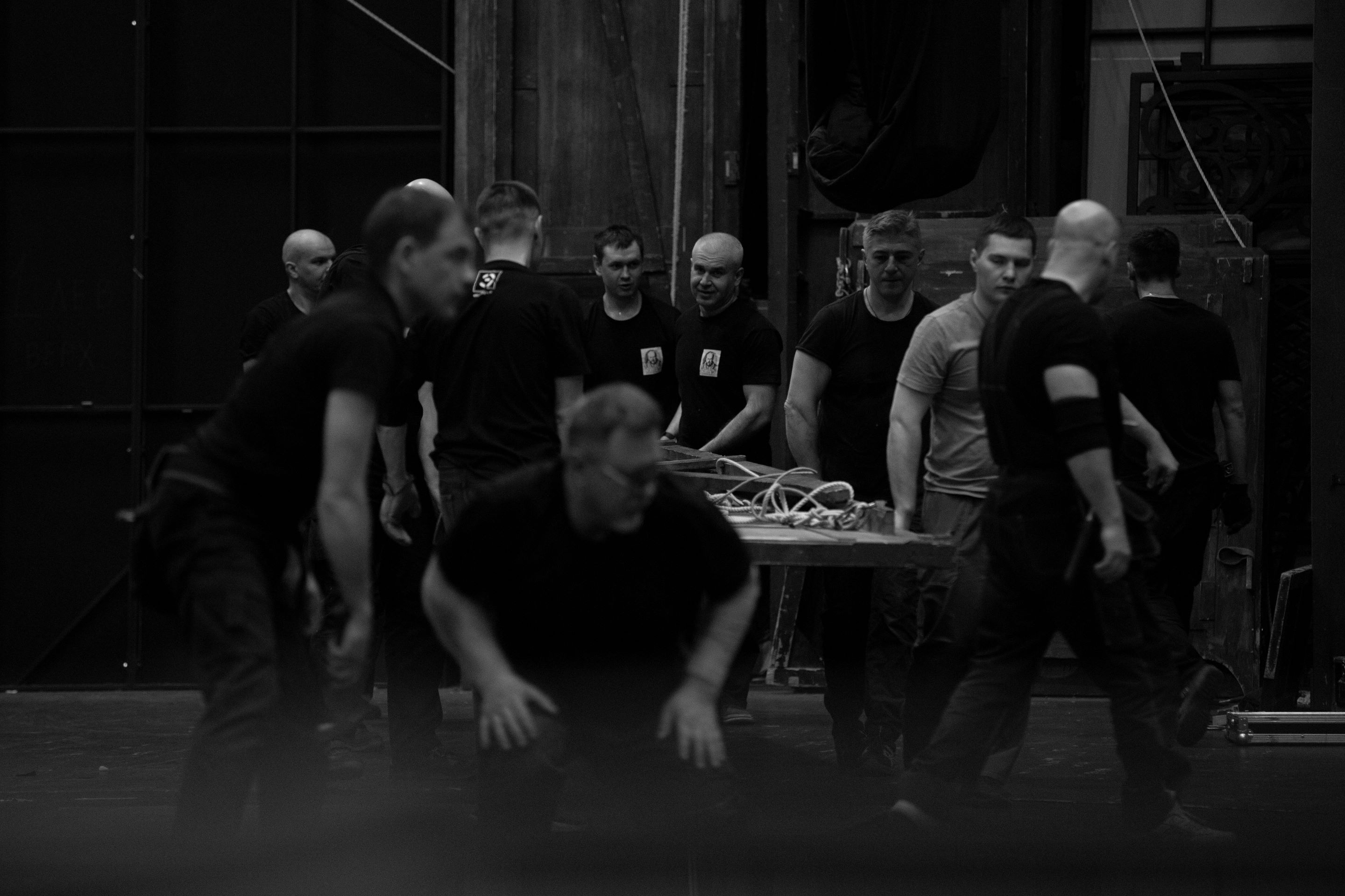 В. Б.: Я думаю, что в этой формуле мастерской, где Женовач, Боровский, Гоберник, дело было так. Сначала был заделан павильон. Потом был приглашён Дамир, художник по свету. Он придумал огромное количество фонарей, этот свет, который бьёт в окна. И все они вместе создали среду.