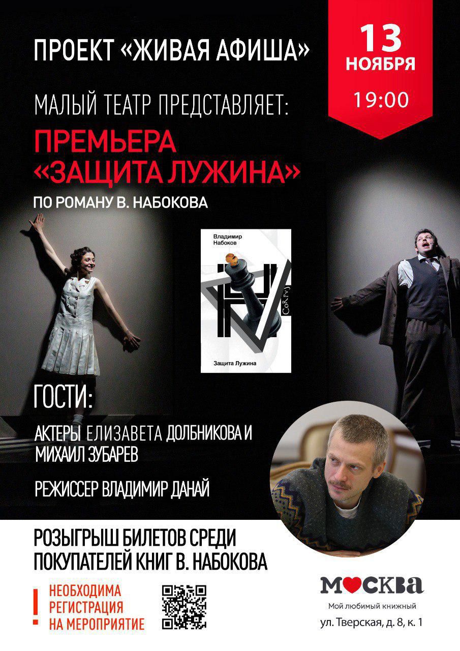 13 ноября в 19:00 в книжном магазине «Москва» в рамках проекта «Живая афиша» состоится встреча с создателями спектакля «Защита Лужина» В.В. Набокова.