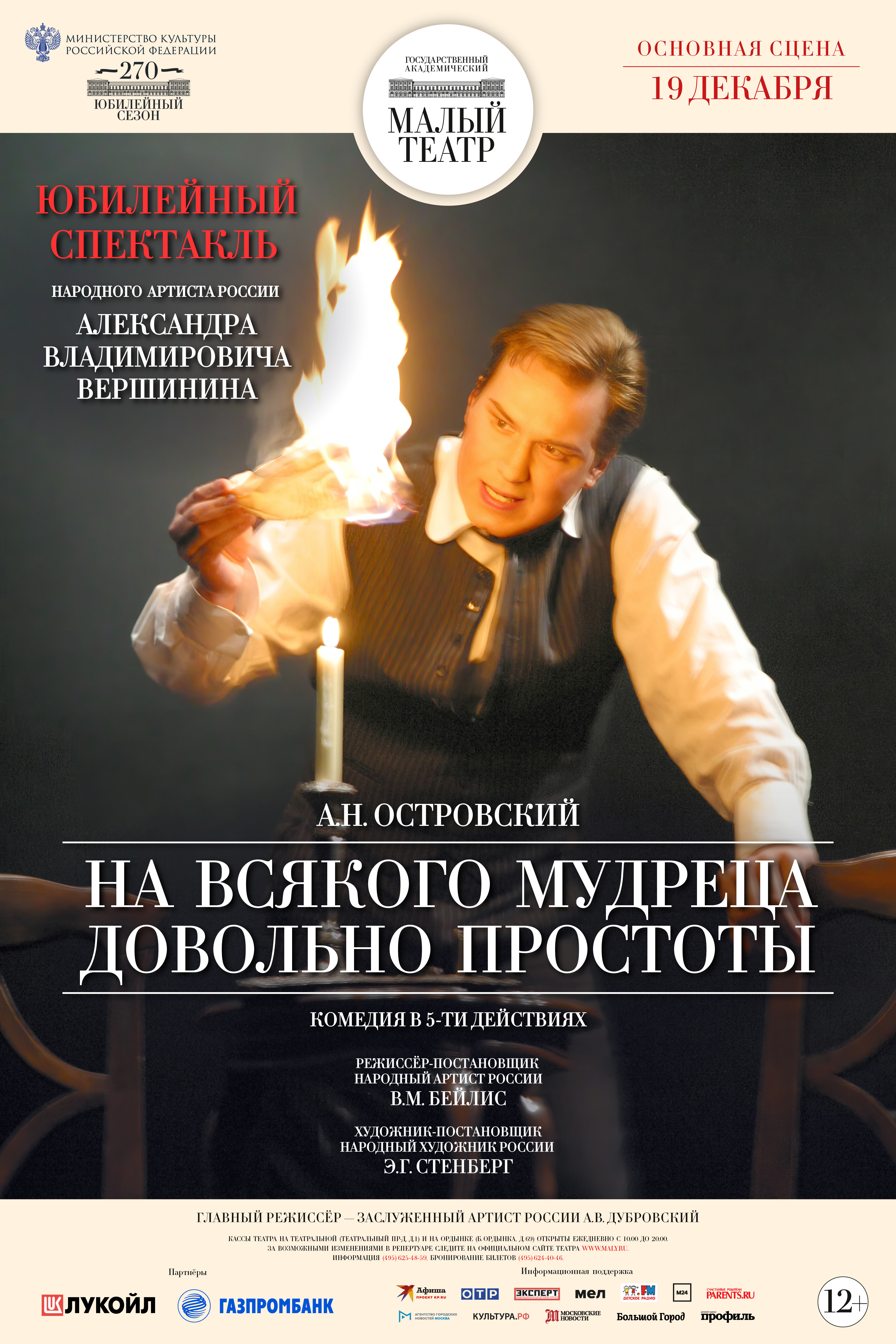 Хотим сообщить зрителям радостную новость. 19 декабря Александр Вершинин отметит свой юбилей спектаклем «На всякого мудреца довольно простоты» А.Н. Островского. В этот день он выйдет на сцену в одной из самых знаковых своих ролей - в роли Глумова.