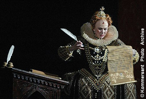 И сами актеры могут точно так же, как в этой «Марии Стюарт», играть в каких-то других спектаклях. Хотя выглядят так, как положено знакомым героиням. Елизавета (Людмила Титова) будет ровно такой, какой и должна вроде бы быть,– отдаленно напоминающей портреты рыжеволосой королевы-девственницы с высоким лбом; интриганкой, притворой и умной властительницей с несчастной женской судьбой. Пленница (Ольга Молочная) предстанет именно такой, какой она навсегда запечатлена в коллективном бессознательном,– молодой гордячкой и красавицей со сжатыми губами, которая поднимается на плаху точно кинозвезда на сцену за ожидаемой наградой. (Кстати, реальной Марии Стюарт, когда ей отрубили голову, было уже 45 лет; Елизавете тогда же стукнуло 54.)