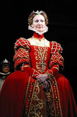 Сходить на «Марию Стюарт» - все равно что отправиться на машине времени в позапрошлое столетие. Красиво расходится бархатный занавес, на артистах костюмы, скопированные с картин XVI-XVII веков. После эффектных реплик хлопают клакеры. Поворотный круг вращается без сучка и задоринки, а на круге расставлены хлипкие колоннады, грозные башни Тауэра и картонные деревья, изображающие парк, где происходит знаменитая встреча двух королев. Режиссер Виталий Иванов блистательно отсутствует, но актеры с успехом справляются без него. Людмила Титова - Елизавета и Валерий Бабятинский - Берли - главные звезды этого шоу. Молодой Василий Зотов в роли Мортимера слегка шепелявит, зато у него стройные ноги. В общем, это добрый старый театр во всей красе. «Мария Стюарт» на сцене филиала Малого театра 1, 7, 16, 21, 28 и 31 марта.