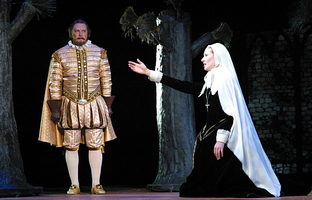 Спектакль Виталия Иванова можно было бы назвать классическим. Здесь все, как должно быть в традиционной постановке: декорации — величественные стены английских замков, костюмы — роскошные пышные платья и расшитые камзолы. Шотландская королева Мария томится в плену у своей венценосной сестры Елизаветы, во власти которой даровать свободу или осудить на вечное заключение и даже смерть.