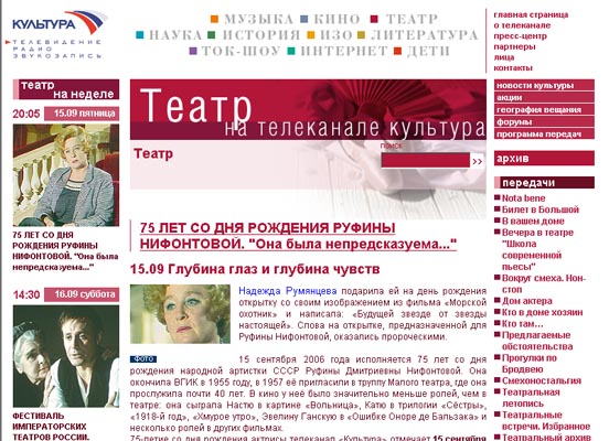15 сентября 2006 года исполняется 75 лет со дня рождения народной артистки СССР Руфины Дмитриевны Нифонтовой. Она окончила ВГИК в 1955 году, в 1957 её пригласили в труппу Малого театра, где она прослужила почти 40 лет. В кино у неё было значительно меньше ролей, чем в театре: она сыграла Настю в картине «Вольница», Катю в трилогии «Сёстры», «1918-й год», «Хмурое утро», Эвелину Ганскую в «Ошибке Оноре де Бальзака» и несколько ролей в других фильмах.