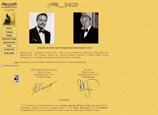 10 октября 2001 года Малый театр обрел свое место в виртуальном мире сети Интернет. С тех пор прошло пять лет – сегодня наш первый юбилей. Символично, что он совпал с юбилеем самого театра, да еще с таким значительным – 250-летием! Четверть тысячелетия и 5 лет. За это время сайт превратился из обычной театральной странички в настоящий информационный портал, в котором мы стараемся как можно полнее отображать и «дела давно минувших дней» и текущую жизнь театра. Сегодня мы адресуем свои поздравления и шлем привет вам – посетителям сайта Малого театра. С каждым годом вас становится все больше, а это накладывает на нашу работу дополнительную ответственность. С праздником!
