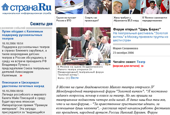 В Москве на сцене Академического Малого театра открылся IV Международный театральный форум «Золотой витязь». «Я постоянно задаюсь вопросом, почему я взялся за театр. Но мы пришли на театральные подмостки четыре года назад. И девиз наш был тем же, что и на кинофоруме, - «За нравственные христианские идеалы, за возвышение души человека», - рассказал перед началом работы фестиваля его президент, народный артист России Николай Бурляев. Форум открылся спектаклем Малого театра «Царь Борис» по исторической драме Алексея Толстого. А золотая медаль имени Н.Д. Мордвинова на торжественной церемонии открытия была вручена руководителю этого театра, народному артисту СССР Юрию Соломину.
