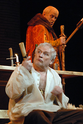Что интересно, в этот раз «перепиской» Островского никто из режиссеров не грешил. И если при этом два спектакля («Бальзаминов» и «Женитьба Белугина») интересны прежде всего в театральном контексте, то оставшиеся два сделаны как явный диалог между историей и современностью и потому вдвойне привлекательны. Эпизоды и приметы бесконечной «смены власти» почти всегда сопровождающиеся «русским бунтом» и всеобщей смутой, куда как актуальны и по сей день. Вот режиссер Владимир Драгунов в Малом театре и попытался в своем «Дмитрии Самозванце» сконцентрировать эти приметы, дать их в обобщенном виде, порой призывая актеров к прямым обращениям в зрительный зал. И надо сказать, известные опасения в старомодности данной пьесы для восприятия, тяжеловесности ее языка быстро рассеялись. Потому что актеры Борис Невзоров (Шуйский) и Глеб Подгородинский (Самозванец) отнюдь не демонстрировали мастерство классической декламации и, отчасти воплощаясь в личностей исторических, сами не забывали о вышеупомянутом живом диалоге разных эпох.