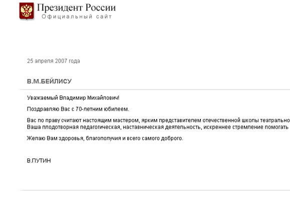 ПОЗДРАВИТЕЛЬНАЯ ТЕЛЕГРАММА ВЛАДИМИРУ БЕЙЛИСУ