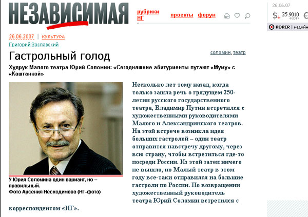 Несколько лет тому назад, когда только зашла речь о грядущем 250-летии русского государственного театра, Владимир Путин встретился с художественными руководителями Малого и Александрийского театров. На этой встрече возникла идея больших гастролей - один театр отправится навстречу другому, через всю страну, чтобы встретиться где-то посреди России. Из этой затеи ничего не вышло, но Малый театр в этом году все-таки отправился на большие гастроли по России. По возвращении художественный руководитель театра Юрий Соломин встретился с корреспондентом «НГ».