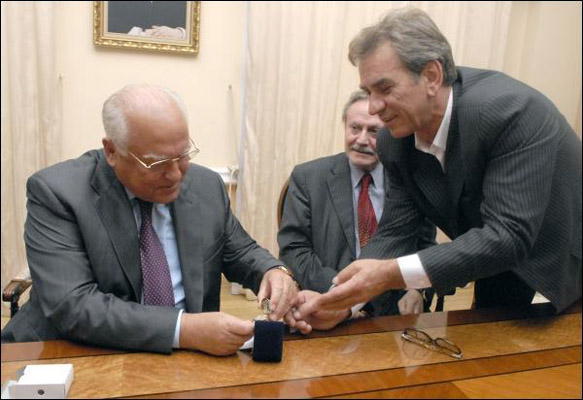 — Это вам, Виктор Степановиу, подарок, — отвечает тот. Достает из бархатного футляра наручные часы с надписью: ”Малый театр. 250 лет”. Помогает послу надеть их. Надевая, спрашивает: