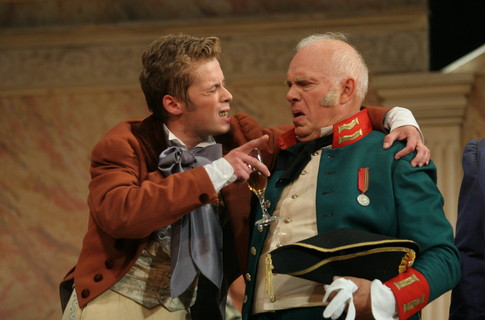 Реплика Земляники о том, что «Человек простой если умрет — и так умрет, а если выздоровеет — и так выздоровеет», которая на репетиции год назад рассмешила Полякову, заставила хохотать и киевлян (наверное, в зале было много «простых» людей). Хлестаков в исполнении молодого Дмитрия Солодовника по началу меня просто возмутил: я все время сравнивала Хлестакова Гоголя и Хлестакова-Миронова (поставленного когда-то в театре Сатиры) — он поражает своим напором и самоуверенностью даже без гроша в кармане. А Хлестаков Солодовника настолько «невзрачный и тоненький» (каким уже после разоблачения увидит его городничий) — даже своего слугу Осипа (">Виктор Низовой) он бьет платком по лицу с такой инфантильностью и беспомощностью! Страх чиновника более чем убедителен, но замысел Соломина раскрывается только к концу — он показал развитие Хлестакова поэтапно, раскрывая мораль самого Гоголя — «Вначале был взяточник, и только потом — ревизор». Чиновники своими руками создали Хлестакова. Теперь им остается только давать «на лапу». Даже жена городничего (Людмила Полякова) не отстает от супруга: «Приходи, Осип, ко мне — тоже получишь!» В Анне Андреевне Поляковой есть все: тонкий юмор, кокетство, строгость, расчетливость… Соломин не ошибся, выбрав ее на главную роль. Одному из самых длинных спектаклей, хронометражем в 4 часа, зритель аплодировал стоя — ни один человек не покинул зал между действиями.