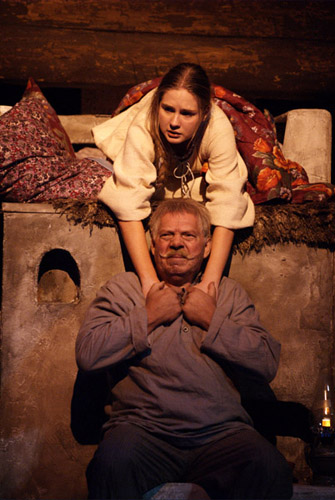 Про пьесу «Власть тьмы» можно было бы сказать, что она особенно актуальна сегодня, в пору падения нравов и всесилия денег. Но подобные банальные вещи можно говорить о других классических произведениях, а не о творчестве Толстого, которое своевременно во все эпохи: ведь затрагивает он самые существенные, глубинные проблемы бытия, проблему сущности человека вообще. Главный конфликт произведения – борьба человечности и бесчеловечности: в масштабах общества, семьи, души человека. Один из персонажей «Власти тьмы», видавший виды Митрич (в спектакле Малого театра его играет А.Потапов) сравнивает деревенских баб со «зверями лесными», которые «ничего не боятся». По мнению Митрича, это оттого, что баба «не то что про Бога, она и про пятницу-то не знает толком». И заголовок пьесы тоже подсказывает, что причина бесчеловечной, звериной жестокости, воплощенной в произведении, – «тьма», невежество, неразвитость. Просвещение, религиозность, богобоязненность, наконец, нравственный закон – казалось бы, вот средства, чтобы освободить людей от этой тьмы, от звериного начала, от жестокости. Возможно, и сам автор так мыслил. Но Лев Толстой – прежде всего гениальный художник слова, и художественное начало оказывается сильнее мыслительного, и художественная правда берёт верх над моральными и религиозными взглядами. И обнаруживается, что и страх Божий, и нравственный закон – это только форма, а суть-то дела в том, что тёмные и светлые силы борются в душе самого человека, и самосохранение его зависит от того, чем закончится эта борьба. Не случайно у творения Льва Толстого есть и подзаголовок – «Коготок увяз, всей птичке пропасть». Цепь компромиссов с силами зла приводит молодого крестьянина Никиту на край нравственной гибели, и перед лицом этой гибели душа его восстаёт против власти тьмы и приводит к покаянию. Несомненно, именно Никита – главный герой трагедии (к такому жанру естественно отнести «Власть тьмы»). А.Фаддеев изображает Никиту простодушным и даже совестливым парнем, запутавшимся и растерявшимся, но хорохорящимся, разбогатев после женитьбы на Анисье, отравившей своего богатого мужа Петра (В.Носик). Рисунок игры артиста достаточно сдержанный, режиссёр убрал из роли самые острые куски (например, подробные описания убийства младенца, прижитого Никитой с падчерицей Акулиной), а перед заключительным эпизодом действия и речи героя кажутся даже вялыми и несколько затянутыми. Но это поведение оказывается затишьем перед бурей – и вот мы становимся свидетелями пронзительно точной игры артиста в сцене покаяния: как ружейные залпы, следуют друг за другом его земные поклоны, просьбы о прощении – как неудержимые рыдания, хотя герой не плачет – он спокоен и отрешён от всего, поскольку переступил через всё – и через свои грехи, и через свою слабость, и когда он выпаливает: «Больше ничего не скажу», – мы понимаем: он всё сказал и всё сделал, закончил свой крестный путь грешника. Игра А.Фаддеева не может оставить равнодушными присутствующих в зале. Уже из-за одной заключительной сцены стоит посмотреть этот спектакль. На наш взгляд, роль Никиты – значительное достижение и молодого актёра, и режиссуры.