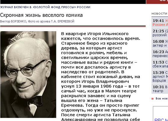 Игоря Ильинского кажется, что остановилось время. Старинное бюро из красного дерева, за которым артист готовился к ролям, мебель и светильники царских времен, массивные вазы и редкие книги – почти все досталось артисту в наследство от родителей. В кабинете стоит кожаный диван, на котором Игорь Владимирович уснул 13 января 1986 года – в тот самый час, когда в Малом театре раскрылся занавес и на сцену вышла его жена – Татьяна Еремеева. Тогда он просто прилег отдохнуть, но уже не проснулся. После смерти артиста Татьяна Александровна не позволила себе выбросить ни одной его вещи. И по сей день в прихожей висит пальто Ильинского, а в шифоньере – концертный костюм. Кажется, что хозяин сейчас выйдет из комнаты – встретить гостей. 4 июля Татьяне Еремеевой-Битрих исполнится 95 лет. Несмотря на возраст она по-прежнему играет в Малом театре. Молодые артисты труппы не знают, что она была супругой Ильинского. О своей жизни с выдающимся артистом она предпочитает не говорить за пределами семьи. Но для читателей «Театрала» сделала исключение…