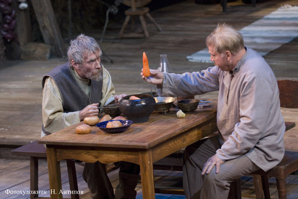 Ноту здравого смысла вносит в спектакль старик-работник Митрич (А. Потапов), который утешает Анютку (Л. Милюзина) в страшной сцене совершающегося убийства в погребе. Именно Митрич в разговоре с Акимом обсуждает деятельность банков, а точнее, то, как банки с помощью процентов зарабатывают деньги. Эта сцена неизменно вызывает ироничное оживление в зале. Но даже в этом прямом пересечении с современностью не обнаружите стремления театра к «актуализации» постановки. Но она, актуализация, достигается, как ни странно, именно этой царственной отстраненностью.