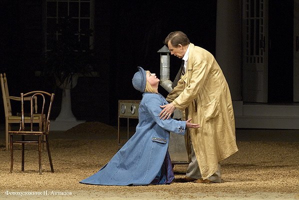 Артисты Малого театра в этой пьесе отлично делают именно то, что умеют лучше всего: они играют характеры и биографии. Каждая роль - тщательно прописанный портрет, узнаваемо земной и ярко-театральный одновременно. Василий Бочкарев в роли хозяина дома - передвигающийся по комнатам быстрым шагом (вот сейчас не успеет добежать, и что-нибудь в пробирках рванет!), отлично обозначающий вот эту ученую зацикленность на себе и абсолютную слепоту - женщина герою в любви объясняется прямым текстом, а он все просит уточнить, что она имеет в виду. Евгения Глушенко, наделившая свою Меланию узнаваемыми повадками новых русских дам - первого поколения, вот только-только выбившихся из ларечниц. (И нигде не переборщила!) Виктор Низовой, подаривший влюбленному ветеринару и основательность врача, и тщательно скрываемую нервную шаткость, и прописанное в речи украинское детство (когда герой волнуется, акцент звучит сильнее). И, конечно, Александр Коршунов в роли слесаря Егора - пьяный (точнее, никогда не просыхающий) кураж, снисходительность к непонимающим жизнь господам и та угроза, что слышна Лизе и до поры до времени никому больше.