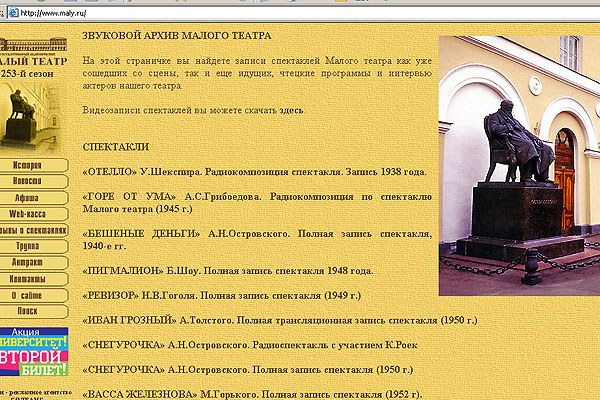 сайте Малого театра: сейчас можно послушать около 200 записей, четверть из них — целые спектакли разных лет, а также отрывки из них и чтецкие программы актеров. Общедоступные фото-, аудио-, видео- и текстовые материалы — отличный способ создать заинтересованное сообщество, уверен администратор www.maly.ru Максим Редин. Посещаемость сайта, по его словам, растет с каждым годом приблизительно на треть. «Прекрасный показатель — посещаемость в летние месяцы, когда театр закрыт. Год от года летняя аудитория увеличивается в той же пропорции, и можно быть уверенным, что эти люди приходят на сайт не за расписанием спектаклей».