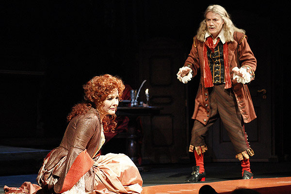 — Ваше величество, где вы найдете такого другого блюдолиза, как Мольер? — говорит Мольер (Соломин), обращаясь к залу. Но величества в зале нет. В зале вообще интересно: над порталом сцены — советский герб, а над «царскими ложами», соответственно, царские гербы. Исторически верно. И как-то не всегда успеваешь за страданиями много чего повидавшего в жизни Мольера. Вот все другие играют — и не сомневаются. Клюев — король, Клюквин — архиепископ. Мощно, строго. А Мольер такой сложный, сомневающийся. Даже в какой-то момент допускаешь: а не мелковата ли эта роль для столь большого артиста? Но — классика есть классика, что уж теперь…