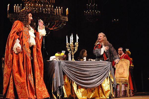 И как антипод мятущейся душе художника непробиваемый в своей равнодушной невозмутимости сиятельный монарх Людовик ХIV. В исполнении Бориса Клюева это персонаж словно из другой пьесы и пришел как будто из другого мира – из будущего. Он свысока цинично взирает на страсти, кипящие у подножия своего трона, и в этой высокомерной отстраненности – позиция артиста по отношению к его герою. Такова современная оценка артиста Клюева персонажа по имени Людовик ХIV.