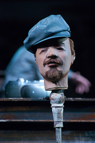Ну а коль зашла речь о Ленине-персонаже, старики тут же запускают тему номер два: анализ времени и личности в истории. А поскольку роль Памятника вождю играет Юрий Каюров, то как не порассуждать на тему третью: былого актерского «социального» величия и нынешнего полного забвения. Кстати, Каюрову, наверное, было что сказать об этом и помимо авторского текста, основываясь на личном опыте. Правда, по счастью, этому замечательному актеру явно повезло, и многолетний «образ вождя» абсолютно не затмил прочего его творчества. Он и сегодня куда как хорош, и не только в «Сне героини», но и в «Горе от ума» Сергея Женовача, например. Эпизод, а как долго помнится! Впрочем, актерский дуэт не стоит разбивать, отдав должное и Владимиру Носику. К ним-то претензии вряд ли стоит предъявлять, они работают весьма честно и профессионально, даже на таком отрывочно-фрагментарном авторском материале. И вот эти «исторические» воспоминания — лучшее в спектакле. Они полны грусти и юмора, особенно когда Шубин — Каюров по старинке «оживляет» своего давнего персонажа, а бутафорская голова Ленина в портретном гриме словно бы оценивает все это со стороны.