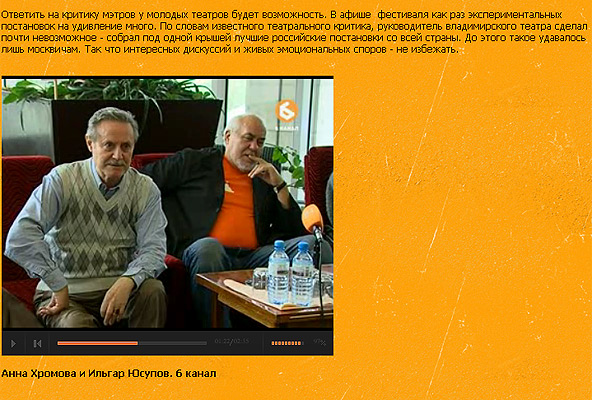 Ответить на критику мэтров у молодых театров будет возможность. В афише фестиваля как раз экспериментальных постановок на удивление много. По словам известного театрального критика, руководитель владимирского театра сделал почти невозможное - собрал под одной крышей лучшие российские постановки со всей страны. До этого такое удавалось лишь москвичам. Так что интересных дискуссий и живых эмоциональных споров - не избежать.