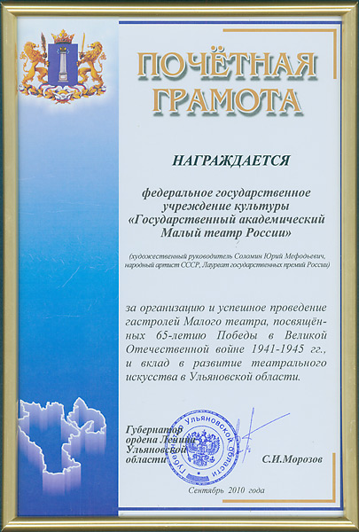 за организацию и успешное проведение гастролей Малого театра, посвященных 65-летию Победы в Великой отечественной войне 1941-45 гг., и вклад в развитие театрального искусства в Ульяновской области.