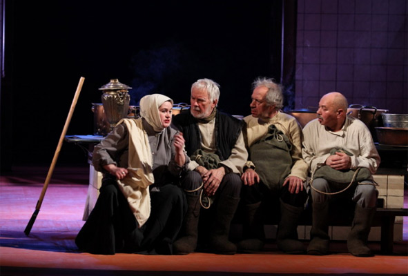 По-толстовски, по принципу резкого контраста, пятнадцати господам противопоставлены в спектакле пятнадцать зависимых от них мужиков и слуг. Первый мужик (арт. М.Пахоменко), наиболее словоохотливый, с явным удовольствием произносит «городские» словечки: «двистительно», «хворменно», «сходственно», второй (арт. М.Кузнецов), грубоватый и правдивый, не говорит лишнего, третий, самый старший (арт. В.Голоднов) – робкий и суетливый. Запоминается и Таня в исполнении Д.Кузнецовой, симпатизирующая мужикам и шумно радующаяся своей удаче. Прекрасно играет роль кухарки И.Шуркина. Мне довелось увидеть в этой роли А.П. Зуеву в спектакле Художественного театра, которая неодобрительно, с насмешкой рассказывала мужикам о привычках и нравах господ. А здесь кухарка негодует, кричит, но за внешней грубостью раскрывает характер доброй женщины, жалеющей и мужиков, и спившегося отставного повара. На неё всегда интересно смотреть. Камердинер Фёдор Иванович в исполнении В.Смородина – человек с чувством собственного достоинства, не заискивающий перед господами, симпатизирующий крестьянам и Тане. Комичен добродушный буфетчик Яков (арт. И.Кумицкий), объясняющий мужикам, что такое «макровы», т.е. микробы. Но не все слуги симпатичны. Ещё Некрасов указывал, что «люди холопского звания – сущие псы иногда». Таков в пьесе и в спектакле лакей Григорий (арт. З.Машненков), нагло пристающий к Тане, считающий себя не хуже господ, уверенный в своей неотразимости.