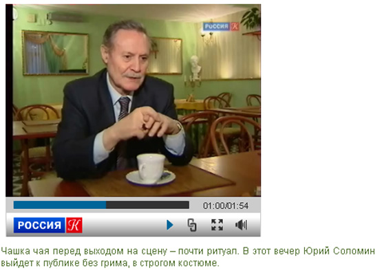 «Сама сцена, сам свет, сама публика, оно уже что-то производит. В тебе уже срабатывает что-то профессиональное, как у спортсмена, когда он на беговой дорожке уже становится на старт», - говорит народный артист СССР, художественный руководитель Малого театра Юрий Соломин.
